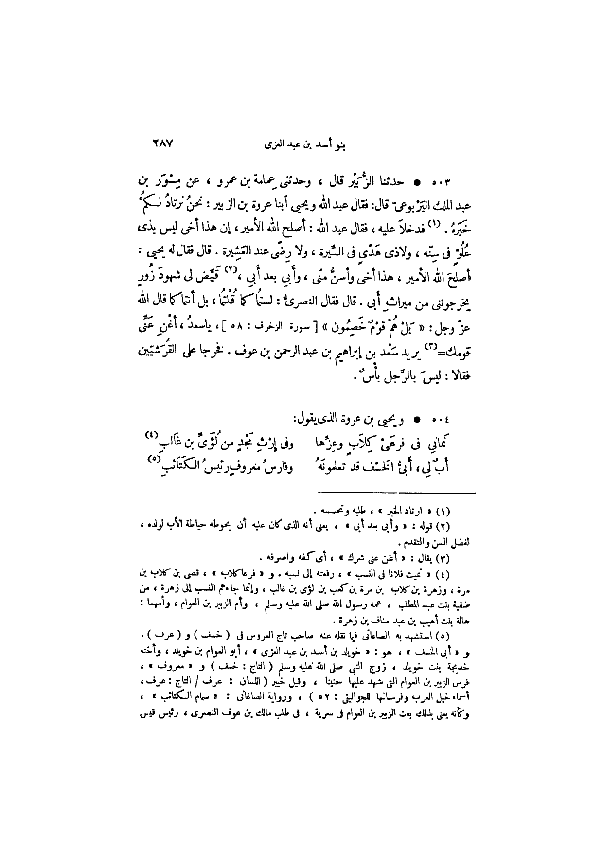 حدثنا الزبير قال، وحدثني عمامة بن عمرو، عن مسور بن عبد الملك اليربوعي قال: فقال عبد الله ويحيى ابنا عروة بن الزبير: نحن نرتاد لكم خبره. فدخلا عليه، فقال عبد الله: أصلح الله الأمير، إن هذا أخي ليس بذي علو في سِنّه، ولاذى هدى في السيرة، ولا رضى عند العشيرة. قال فقال له يحيى: أصلح الله الأمير، هذا أخي وأسن مني، وأبي بعد أبي، قيض لي شهود زور يخرجونني من ميراث أبي. قال فقال النصري: لستما كما قلتما، بل أنتما كما قال الله عز وجل: (بَلْ هُمْ قوْمٌ خَصْمُون) ، يا سعد، أغن عني قومك يريد سعد بن إبراهيم بن عبد الرحمن بن عوف. فخرجا على القرشيين فقالا: ليس بالرجل بأس.