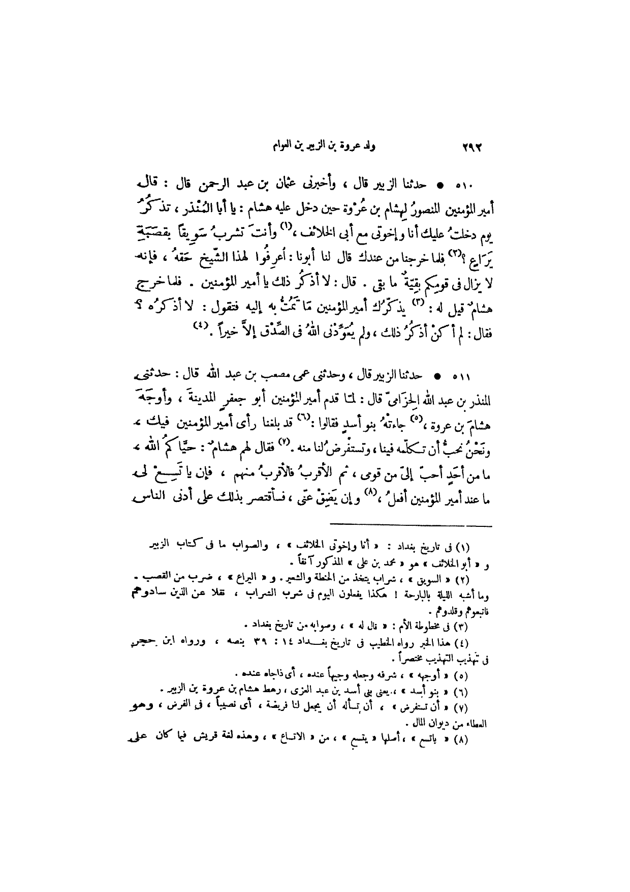 حدثنا الزبير قال، وأخبرني عثمان بن عبد الرحمن قال: قال أمير المؤمنين المنصور لهشام بن عروة حين دخل عليه هشام: يا أبا المنذر، تذكر يوم دخلت عليك أنا وإخوتي مع أبي الخلاف، وأنت تشرب سويقاً بقصبة يراعٍ فلما خرجنا من عندك قال لنا أبونا: اعرفوا لهذا الشيخ حقه، فإنه لا يزال في قومكم بقية ما بقى. قال: لا أذكر ذلك يا أمير المؤمنين. فلما خرج هشام قيل له: يذكرك أمير المؤمنين ما تمت به إليه فتقول: لا أذكره؟ فقال: لم أكن أذكر ذلك، ولم يعودني الله في الصدف إلا خيراً.