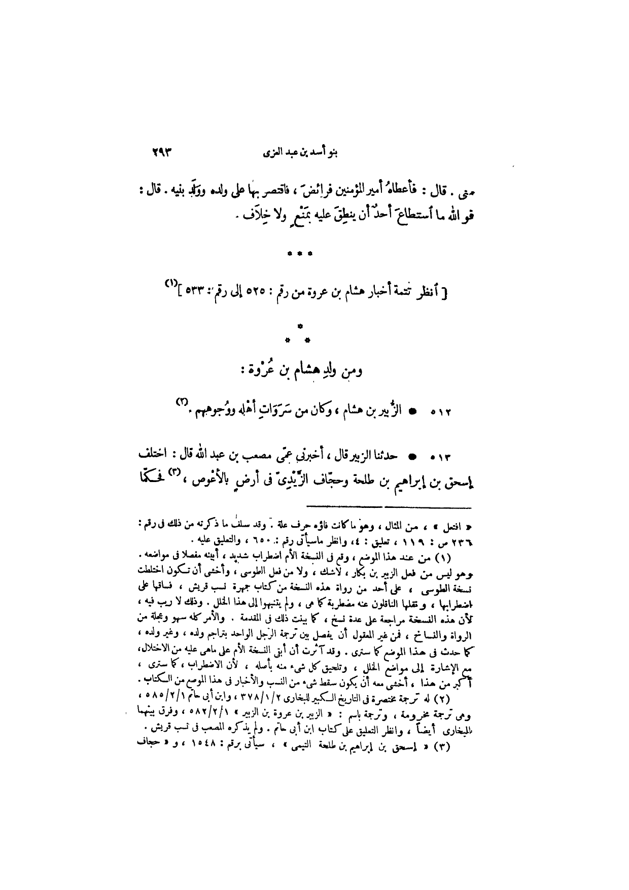 حدثنا الزبير قال، أخبرني عمي مصعب بن عبد الله قال: اختلف إسحاق بن إبراهيم بن طلحة وحجاف الزيدي في أرض بالأعوص، فحكما
