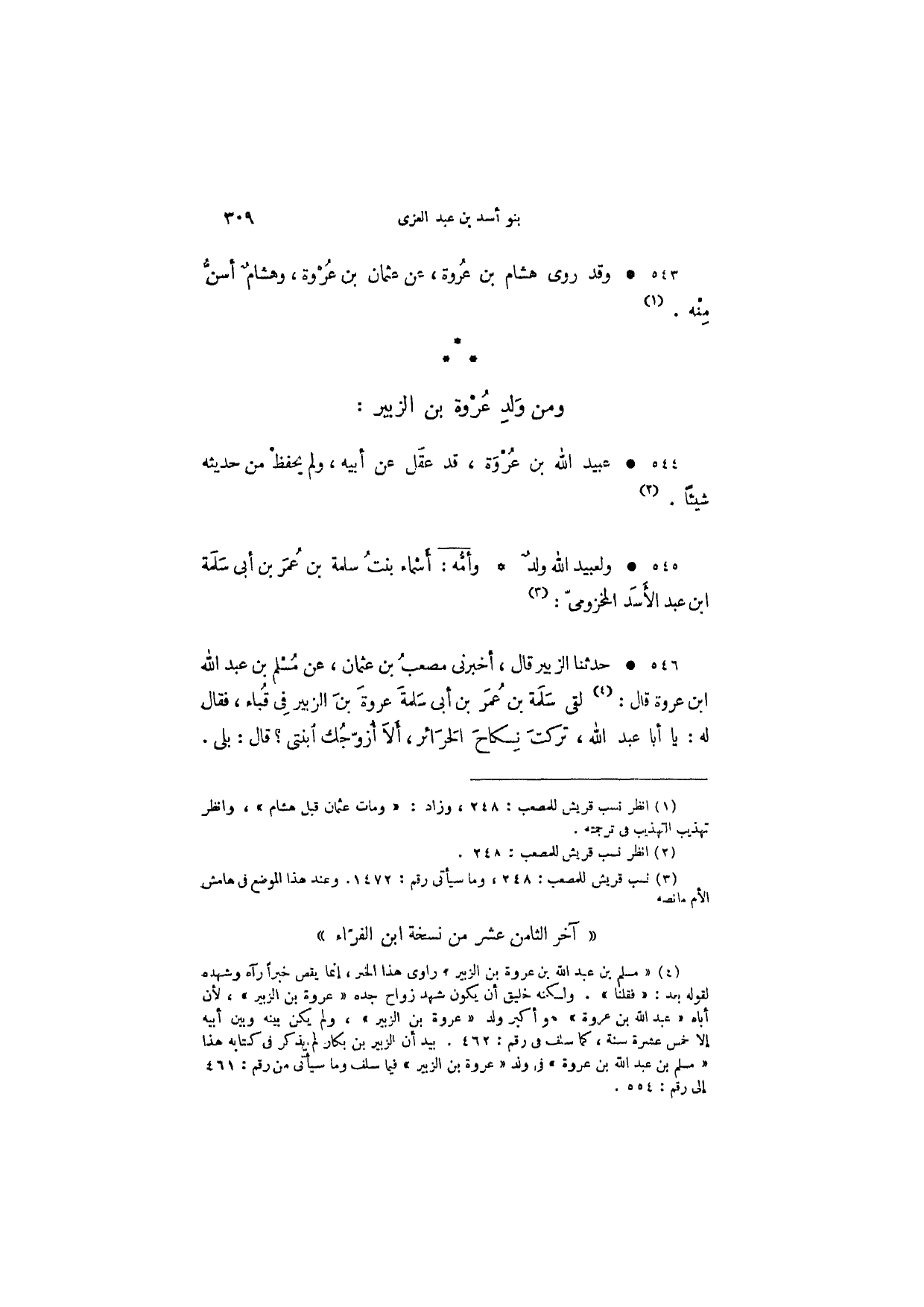 حدثنا الزبير قال، أخبرني مصعب بن عثمان، عن مسلم بن عبد الله ابن عروة قال: لقي سلمة بن عمر بن أبي سلمة عروة بن الزبير في قباء، فقال له: يا أبا عبد الله، تركت نكاح الحرائر، ألا أزوجك ابنتي؟ قال: بلى.