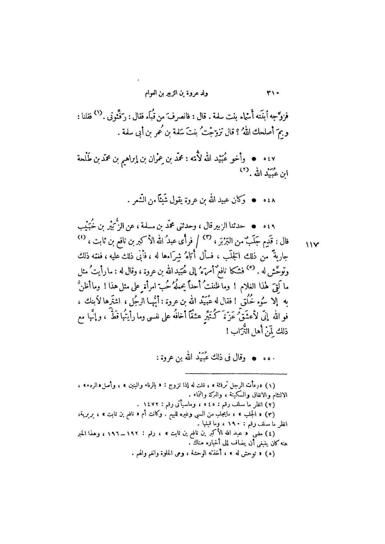 حدثنا الزبير قال، وحدثني محمد بن مسلمة، عن الزبير بن خبيب قال: قدم جلب من البربر، فرأى عبد الله الأكبر بن نافع بن ثابت، جارية من ذلك الجلب، فسأل أباه شرائها له. فأبى ذلك عليه، فغمه ذلك وتوحش له. فشكا نافع أمره إلى عبيد الله بن عروة، وقال له: ما رأيت مثل ما لقي هذا الغلام! وما ظننت أحداً يحمله حب امرأة على مثل هذا! وما أظن به إلا سوء خلق! فقال له عبيد الله بن عروة: أيها الرجل، اشترها لأبنك، فو الله إني لأعشق عزة كثير عشقاً أخافه على نفس وما رأيتها قط، وإنها مع ذلك لمن أهل التراب! وقال في ذلك عبيد الله بن عروة: