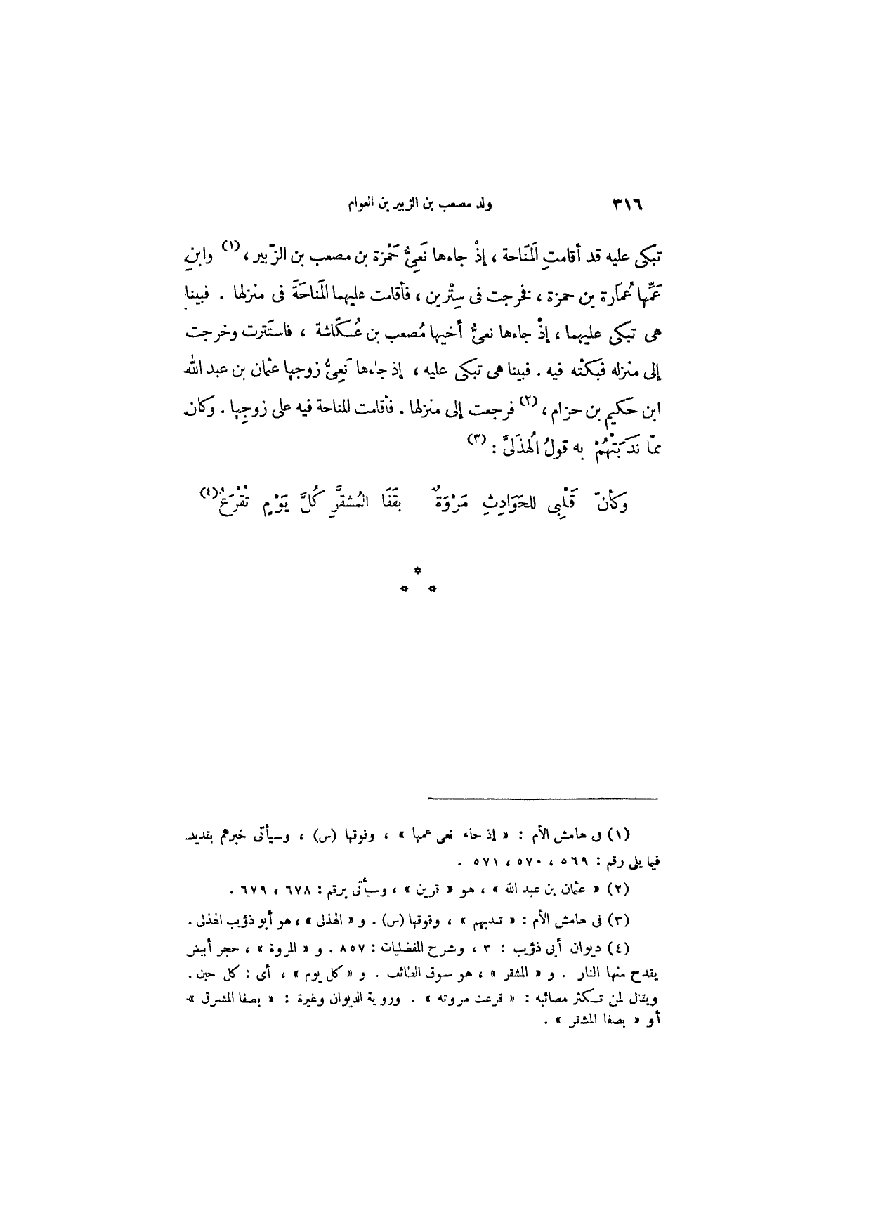 تبكي عليه قد أقامت المناحة، إذ جاءها نعي حمزة بن مصعب بن الزبير، وابن عمها عمارة بن حمزة، فخرجت في سترين، فأقامت عليهما المناحة في منزلها، فبينا هي تبكي عليهما، إذ جاءها نعي أخيها مصعب بن عكاشة، فاستترت وخرجت إلى منزله فبكته فيه. فبيننا تبكي عليه، إذ جائها نعي زوجها عثمان بن عبد الله ابن حكيم بن حزام، فرجعت إلى منزلها. فأقامت المناحة فيه على زوجها. وكان مما ندبتهم به قول الهذلي: