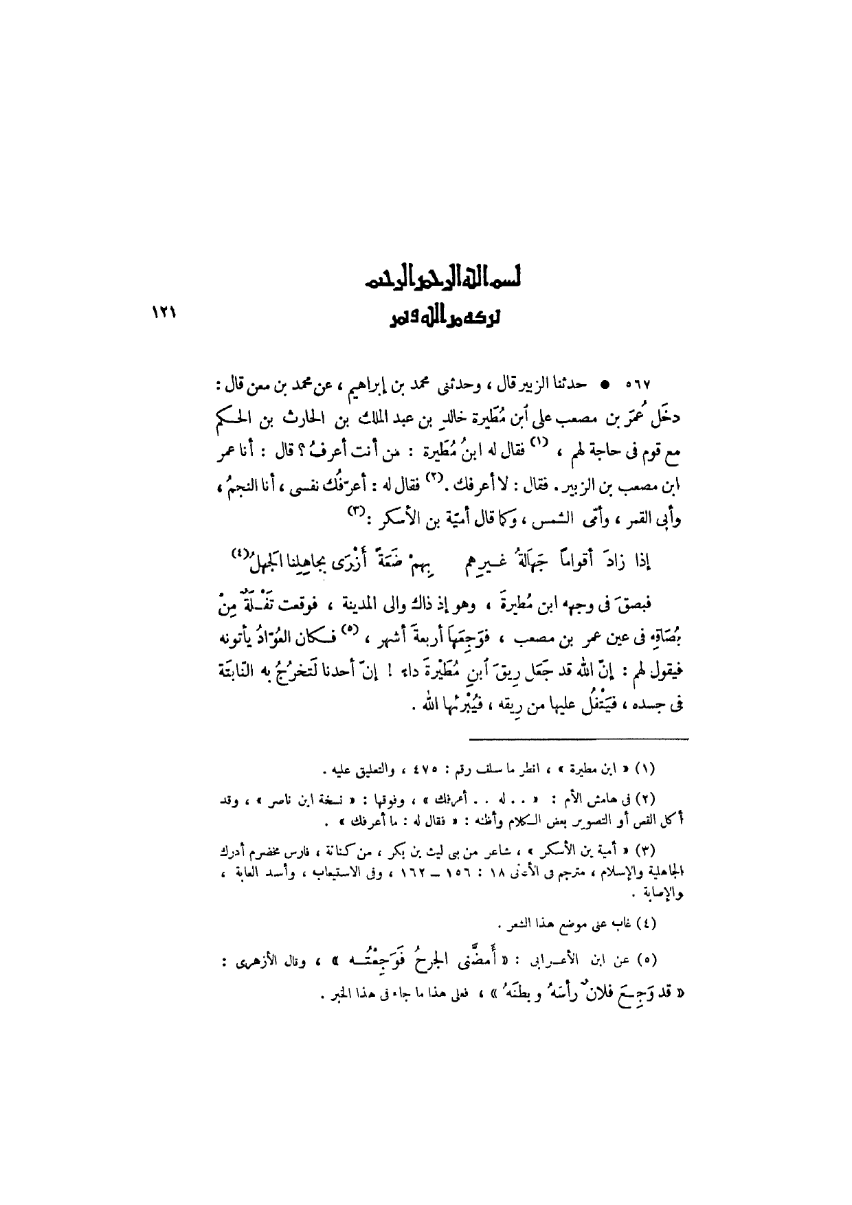 حدثنا الزبير قال، وحدثني محمد بن ابراهيم، عن محمد بن معن قال: دخل عمر بن مصعب على ابن مطيرة خالد بن عبد الملك بن الحارث بن الحكم مع قوم في حاجة لهم، فقال له ابن مطيرة: من أنت أعرف؟ قال: أنا عمر ابن مصعب بن الزبير. فقال: لا أعرفك. فقال له: أعرفك نفسي، أنا النجم، وأبي القمر، وأمي الشمس، وكما قال أمية بن الأسكر: