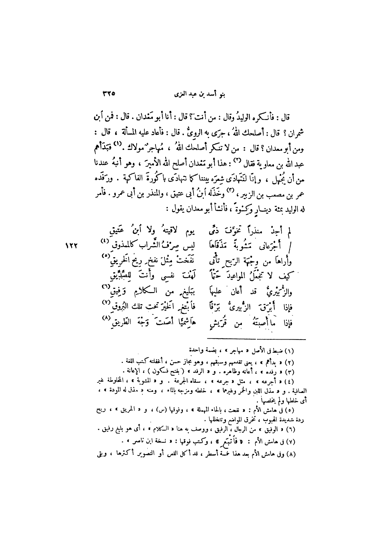 قال: فأنكره الوليد وقال: من أنت؟ قال: أنا أبو معدان. قال: فمن ابن شمران؟ قال: أصلحك الله، جرى به الروى. قال: فأعاد عليه المسألة، قال: ومن أبو معدان؟ قال: من لا تنكر أصلحك الله، مهاجر مولاك. فبدأهم عبد الله بن معاوية فقال: هذا أبو معدان أصلح الله الأمير، وهو أنبه عندنا من أن يجهل، وإنا لنتهادى شعره بيننا كما تتهادى باكورة الفاكهة. ورفده عمر بن صعب بن الزبير، وخذله ابن أبي عتيق، والمنذر بن أبي عمرو. فأمر له الوليد بمئة دينار وكسوة، فأنشأ أبو معدان يقول: