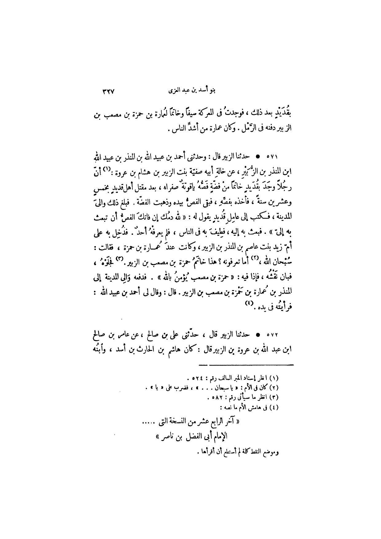 حدثنا الزبير قال: وحدثني أحمد بن عبيد الله بن المنذر بن عبيد الله ابن المنذر بن الزبير، عن خالة أبيه صفية بنت الزبير بن هشام بن عروة: أن رجلاً وجد بقديد خاتماً من فضة فصه ياقوتة صفراء، بعد مقتل أهل قديد بخمس وعشرين سنة، فأخذه بفصه، فبقى الفص بيده وذهب الفضة. فبلغ ذلك والي المدينة، فكتب إلى عامل قديد يقول له: " لله دمك إن فاتك الفص أن تبعث به إليّ ". فبعث به إليه، فطيف به في الناس، فلم يعرفه أحد. فدخل به على أن زيد نبت عاصم بن المنذر بن الزبير، وكانت عند عمارة بن حمزة، فقالت: سبحان الله، أما تعرفونه؟ هذا خاتم حمزة بن مصعب بن الزبير. فجلوه، فبان نقشه، فإذا فيه: " حمزة بن مصعب يؤمن بالله ". فدفعه والي المدينة إلى المنذر بن عمارة بن حمزة بن مصعب بن الزبير. قال: وقال لي أحمد بن عبيد الله: فرأيته في يده.