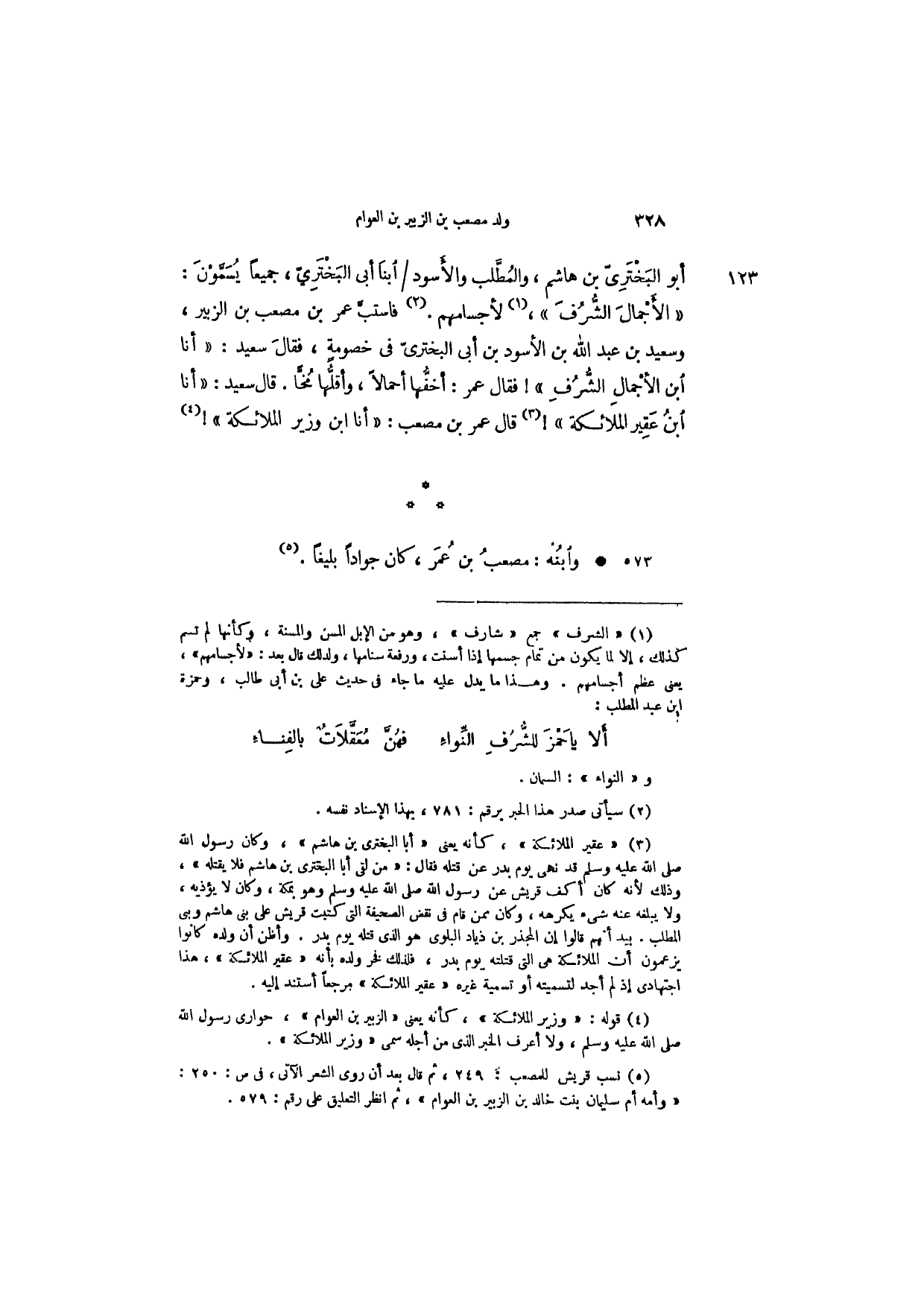 أبو البختري بن هاشم، والمطلب والأسود ابنا البختري، جميعاً يسمون: " الأجمال الشرف "، لأجسامهم. فاستب عمر بن مصعب بن الزبير، وسعيد بن عبد الله بن الأسود بن أبي البختري في خصومه، فقال سعيد: " أنا ابن الأجمال الشرف "! فقال عمر: أخفها أحمالاً، وأقلها مخا. قال سعيد: " أنا ابن عقير الملائكة "! قال عمر بن مصعب: " أنا ابن وزير الملائكة "! وابنه: مصعب بن عمر، كان جواداً بليغاً.