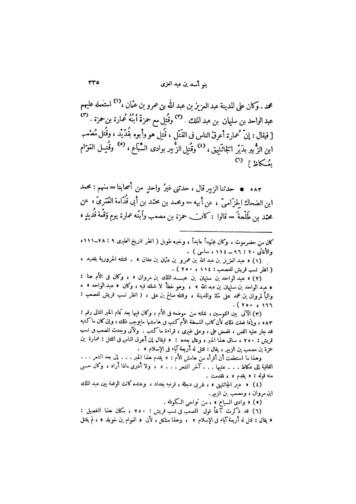 فيقال: إن عمارة أعرق الناس في القتل، قتل هو وأبوه بقديد، وقتل مصعب ابن الزبير بدير الجاثليق، وقتل الزبير بوادي السباع، وقتل العوام بعكاظ حدثنا الزبير قال، حدثني غير واحد من أصحابنا منهم: محمد ابن الضحاك الحزامي، عن أبيه ومحمد بن محمد بن أبي قدامة العمري، عن محمد بن طلحة قالوا: كان حمزة بن مصعب وابنه عمارة يوم وقعة قديد،