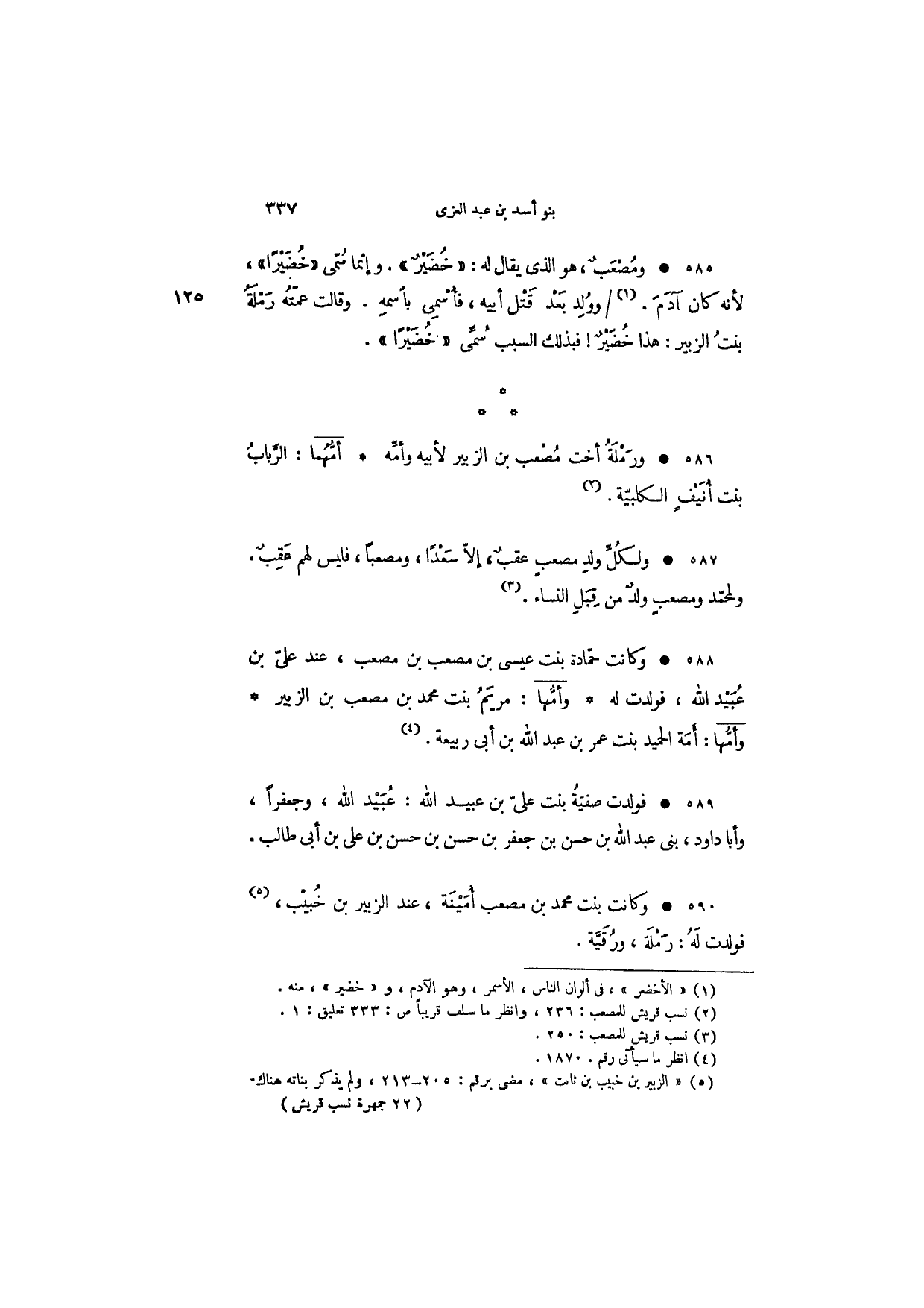 ومصعب، هو الذي يقال له: " خُضَيْرٌ ". وإنما سمي " خُضَيْرًا "، لأنه كان أدم. وولد بعد قتل أبيه، فأسمى باسمه. وقالت عمته رملة بنت الزبير: هذا خضير! فبذلك السبب سمي " خُضَيْرًا ".