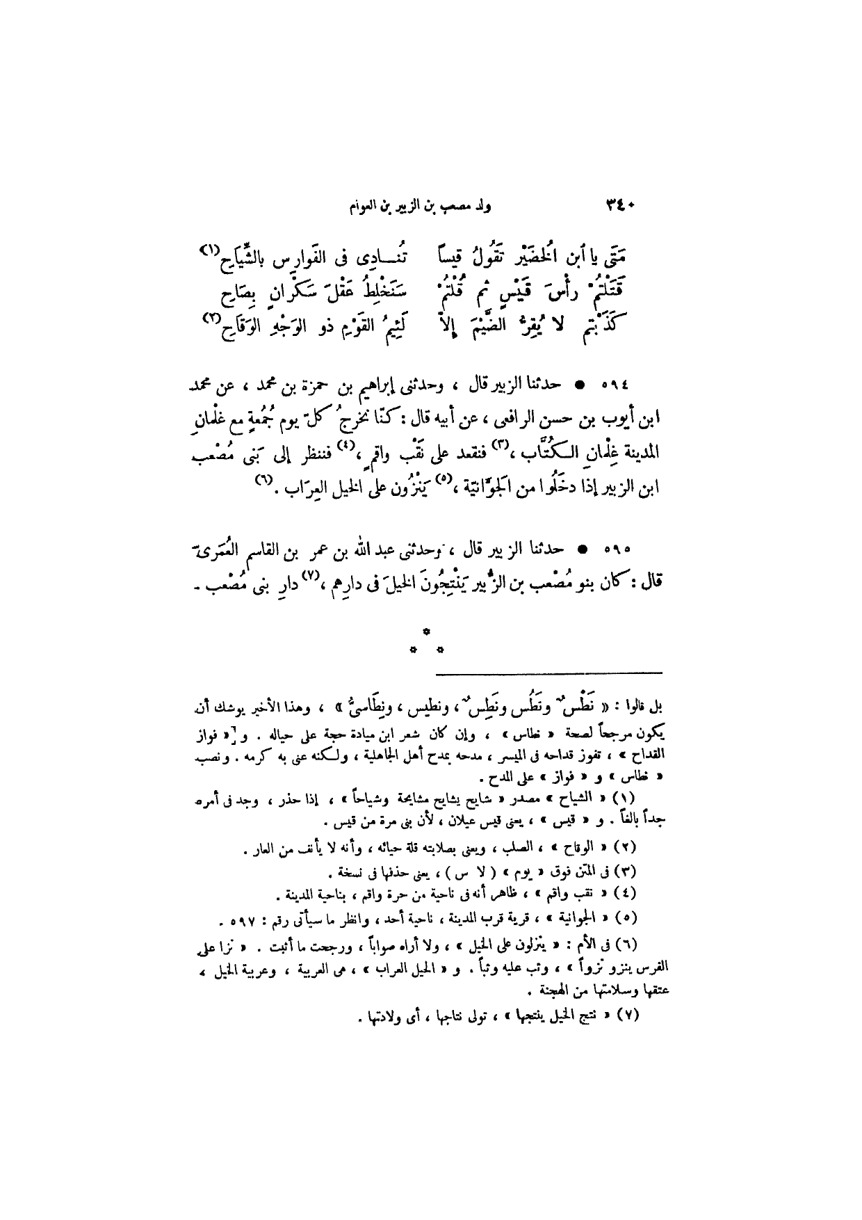 حدثنا الزبير قال، وحدثني عبد الله بن عمر بن القاسم العمري قال: كان بنو مصعب بن الزبير ينتجون الخيل في دارهم، دار بني مصعب.