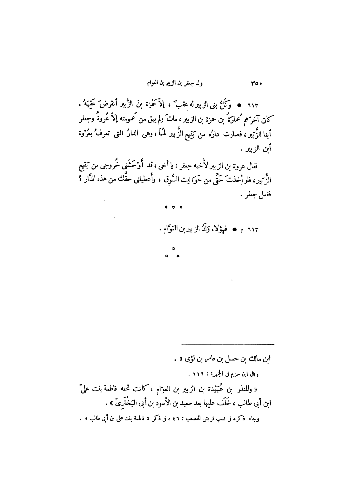 فقال عروة بن الزبير لأخيه جعفر: يا أخي، قد أوحشني خروجي من بقيع الزبير، فلو أخذت حقي من حوانيت السوق، وأعطيتني حقك من هذه الدار؟ ففعل جعفر.