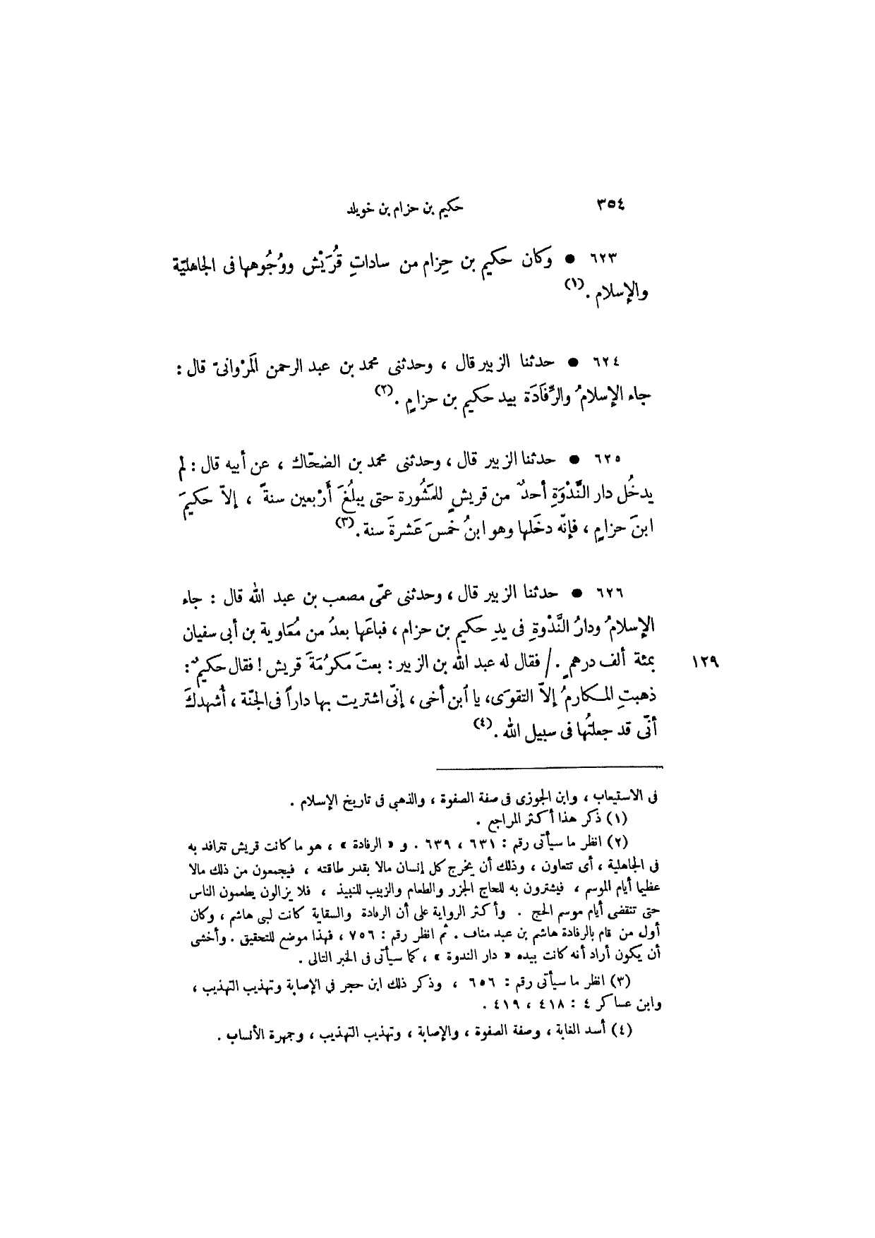 حدثنا الزبير قال، وحدثني عمي مصعب بن عبد الله قال: جاء الإسلام ودار الندوة في يد حكيم بن حزام، فباعها بعد من معاوية بن أبي سفيان بمئة ألف درهم. فقال له عبد الله بن الزبير: بعت مكرمة قريش! فقال حكيم: ذهبت المكارم إلا التقوى، يا ابن أخي، إني اشتريت بها داراً في الجنة، أشهدك أني قد جعلتها في سبيل الله.