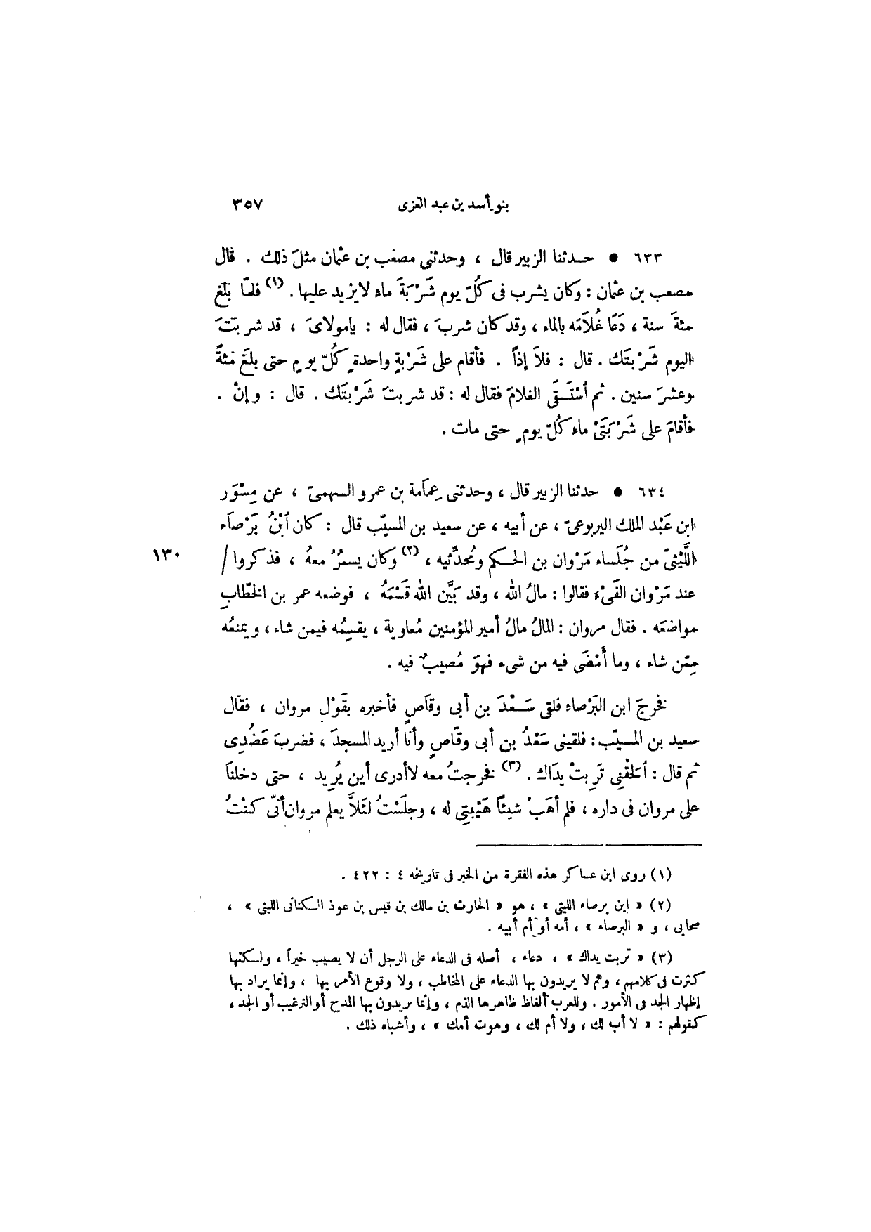 حدثنا الزبير قال، وحدثني عمامة بن عمرو السهمي، عم مسور ابن عبد الملك اليربوعي، عن أبيه، عن سعيد بن المسيب قال: كان ابن برصاء الليثي من جلساء مروان بن الحكم ومحدثيه، وكان يسمر معه، فذكروا عند مروان الفيء فقالوا: مال الله، وقد بين الله قسمة، فوضعه عمر بن الخطاب مواضعه. فقال مروان: المال مال أمير المؤمنين معاوية، يقسمه فيمن شاء، ويمنعه ممن شاء، وما أمضى فيه من شيء فهو مصيب فيه.