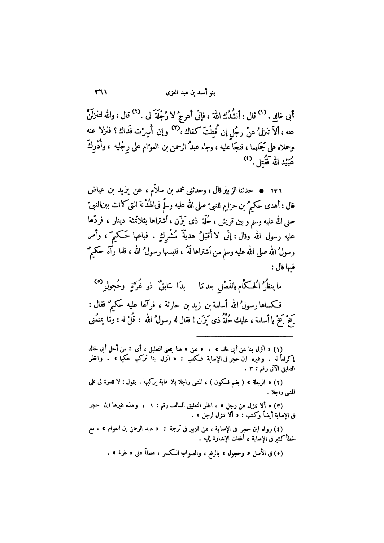 أبي خالد. قال: أنشدك الله، فإني أعرج لا رجلة لي. قال: والله لتنزلن عنه، ألا تنزل عن رجل إن قتلت كفاك، وإن أسرت فداك؟ فنزلا عنه وحملاه على جملهما، فنجا عليه، وجاء عبد الرحمن بن العوام على رجليه، وأدرك عبيد الله فقتل.