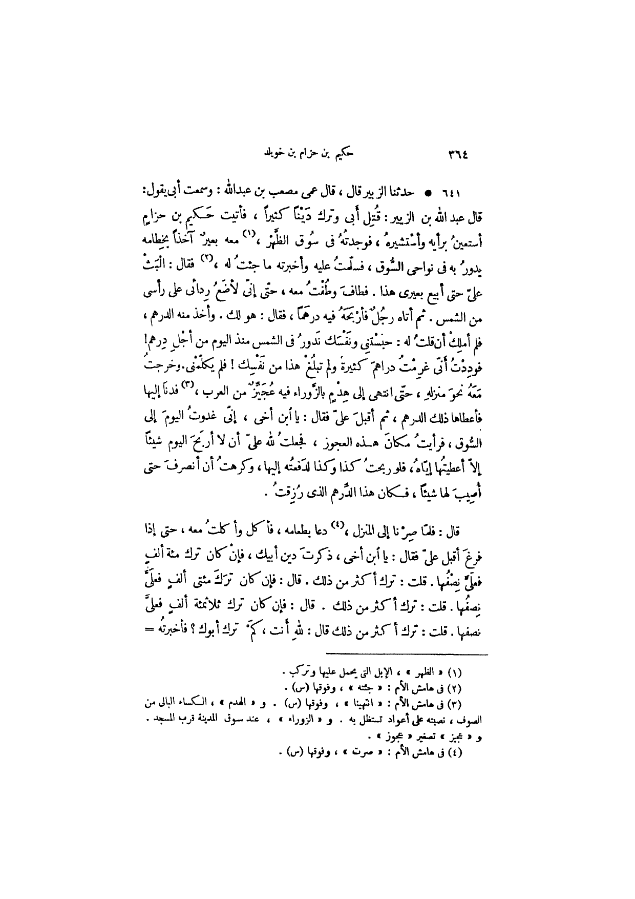 حدثنا الزبير قال، قال عمي مصعب بن عبد الله: وسمعت أبي يقول: قال عبد الله بن الزبير: قتل أبي وترك ديناً كثيراً، فأتيت حكيم بن حزام أستعين برأيه وأستشيره، فوجدته في سوق الظهر، معه بعير آخذاً بخطامه يدور به في نواحي السوق، فسلمت عليه وأخبرته ما جئت له، فقال: البث على حتى أبيع بعيري هذا. فطاف وطفت معه، حتى إني لأضع ردائي على رأسي من الشمس. ثم أتاه رجل فأربحه فيه درهماً، فقال: هو لك. وأخذ منه الدرهم، فلم أملك أن قلت له: حبستني ونفسك ندور في الشمس منذ اليوم من أجل درهم! فوددت أني غرمت دراهم كثيرة ولم تبلغ هذا من نفسك! فلم يكلمني. وخرجت معه نحو منزله، حتى أنتهى إلى هدم بالزوراء فيه عُجَيِّزٌ من العرب، فدنا إليها فأعطاها ذلك الدرهم، ثم أقبل عليّ فقال: يا ابن أخي، غني غدوت اليوم إلى السوق، فرأيت مكان هذه العجوز، فجعلت لله على أن لا أربح اليوم شيئاً إلا أعطيتها إياه، فلو ربحت كذا وكذا لدفعته إليها، وكرهت أن أنصرف حتى أصيب لها شيئاًن فكان هذا الدرهم الذي رزقت.