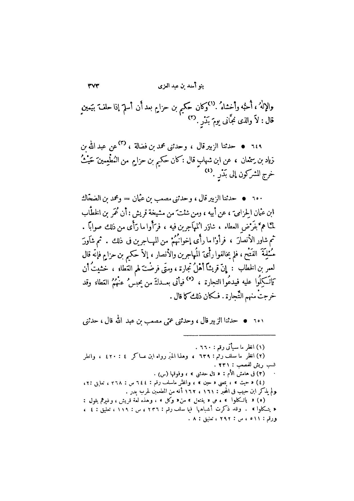 حدثنا الزبير قال، وحدثني مصعب بن عثمان ومحمد بن الضحاك ابن عثمان الحزامي، عن أبيه، ومن شئت من مشيخة قريش: أن عمر بن الخطاب لما هم بفرض العطاء، شاور المهاجرين فيه، فرأوا ما رأى من ذلك صواباً. ثم شاور الأنصار، فرأوا ما رأى إخوانهم من المهاجرين في ذلك. ثم شاور مسلمة الفتح، فلم يخالفوا رأي المهاجرين والأنصار، إلا حكيم بن حزام فإنه قال لعمر بن الخطاب: إن قريشاً أهل تجارة، ومتى فرضت لهم العطاء، خشيت أن ياتكلوا عليه فيدعوا التجارة، فيأتي بعدك من يحبس عنهم العطاء وقد خرجت منهم التجارة. فكان ذلك كما قال.