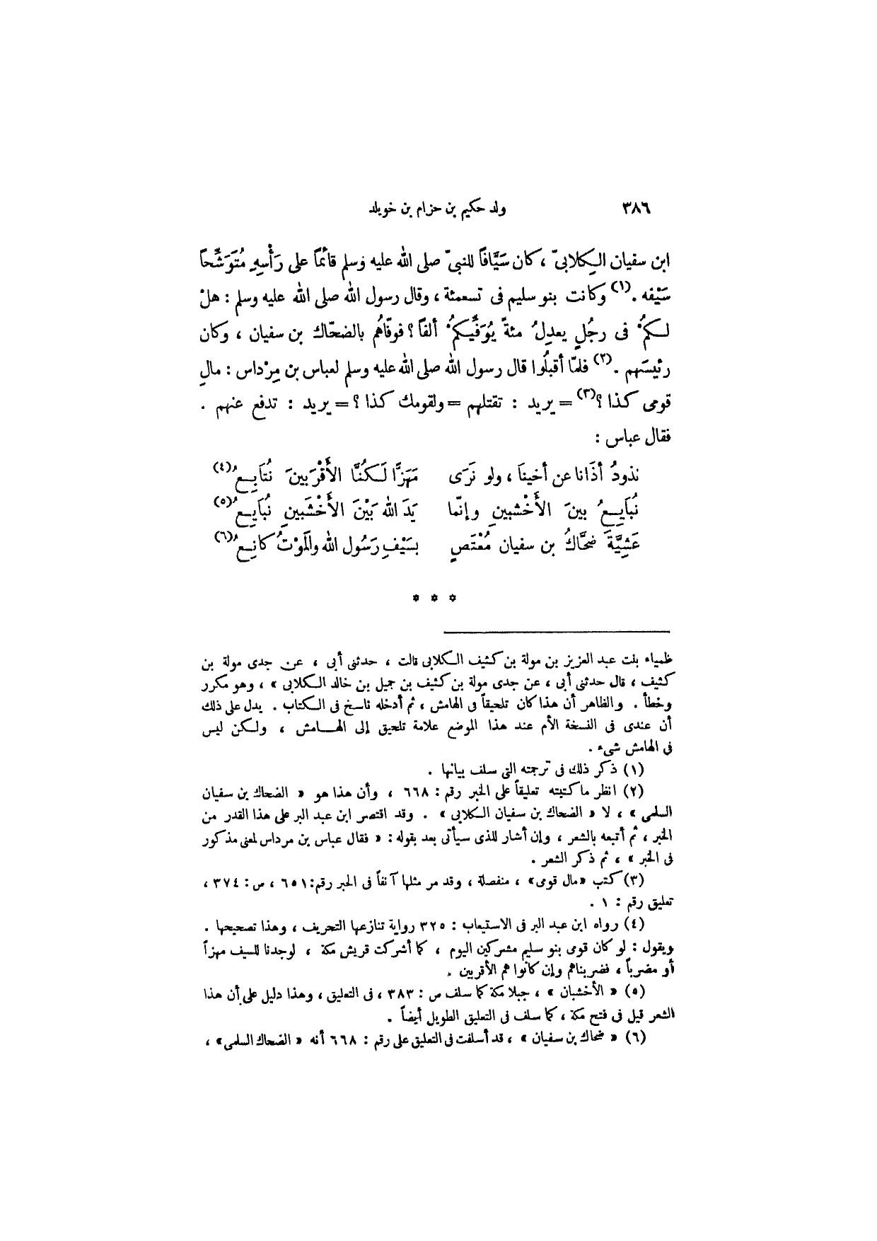 ابن سفيان الكلابي، كان سيافاً للنبي صلى الله عليه وسلم قائماً على رأسه متوحشاً سيفه. وكانت بنو سليم في تسعمئة، وقال رسول الله صلى الله عليه وسلم: هل لكم في رجل يعدل مئة يوفيكم ألفا؟ فوفاهم بالضحاك بن سفيان، وكان رئيسهم. فلما أقبلوا قال رسول الله صلى الله عليه وسلم لعباس بن مرداس: مال قومي كذا؟ يريد: تقتلهم، ولقومك كذا؟ يريد: تدفع عنهم.