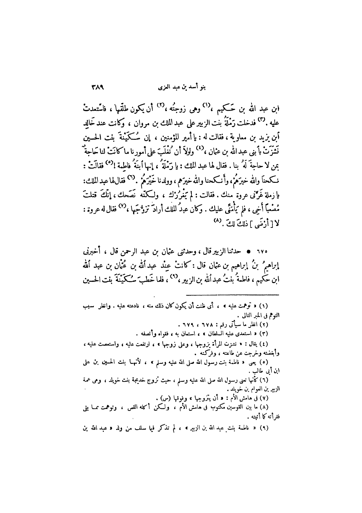 حدثنا الزبير قال، وحدثني عثمان بن عبد الرحمن قال، أخبرني إبراهيم بن إبراهيم بن عثمان قال: كانت عند عبد الله بن عثمان بن عبد الله ابن حكيم، فاطمة بنت عبد الله بن الزبير، فلما خطب سكينة بنت الحسين