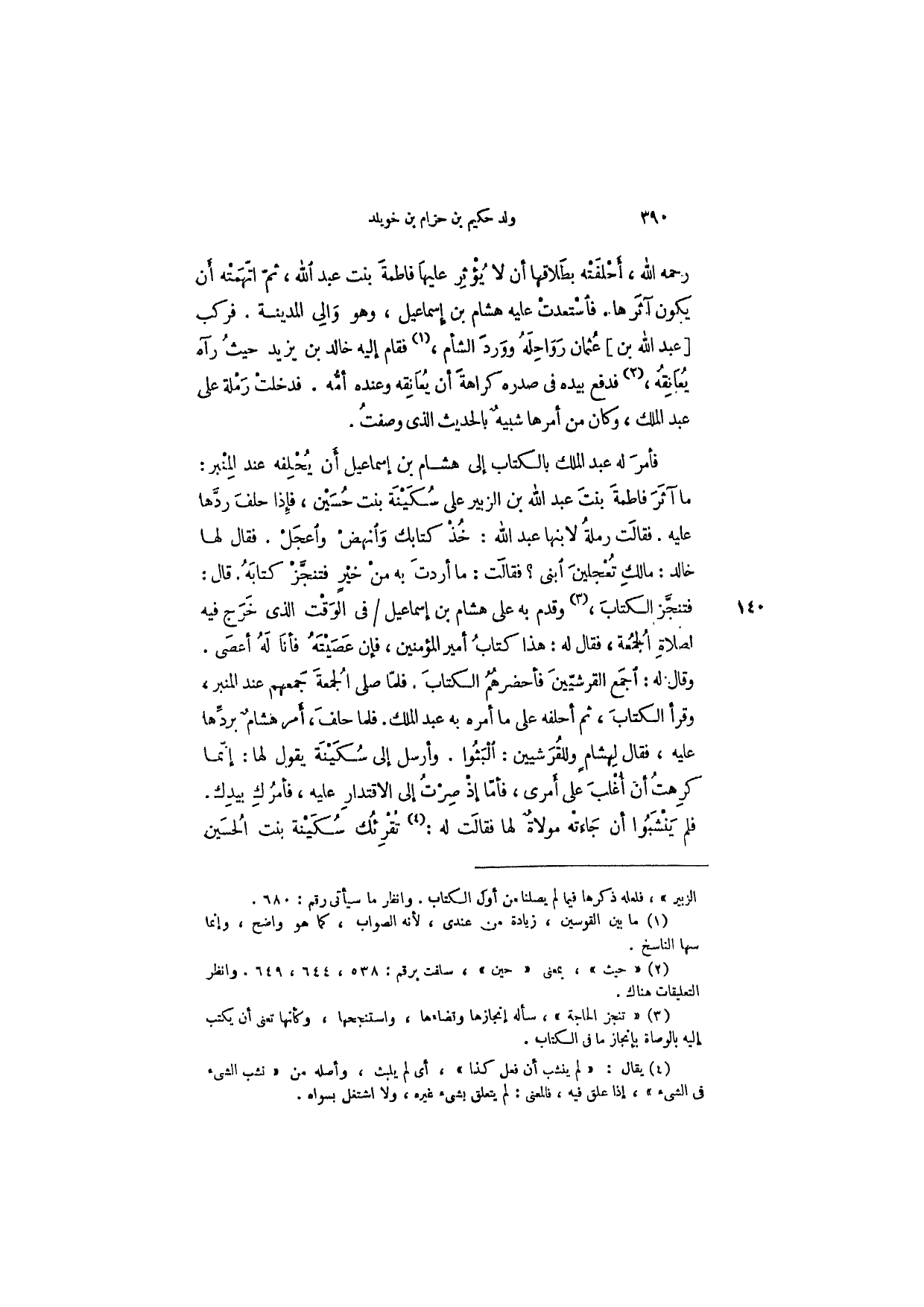 فأمر له عبد الملك بالكتاب إلى هشام بن إسماعيل أن يحلفه عند المنبر: ما آثر فاطمة بنت عبد الله بن الزبير على سكينة بنت حسين، فإذا حلف ردها عليه. فقالت رملة لأبنها عبد الله: خذ كتابك وأنهض وأعجل. فقال لها خالد: مالك تعجلين ابني؟ فقالت: ما أردت به من خير فتنجز كتابه. قال: فتنجز الكتاب، وقدم به على هشام بن إسماعيل في الوقت الذي خرج فيه لصلاة الجمعة، فقال له: هذا كتاب أمير المؤمنين، فإن عصيته فأنا له أعصى. وقال له: اجمع القرشيين فأحضرهم الكتاب. فلما صلى الجمعة عند المنبر، وقرأ الكتاب، ثم أحلفه على ما أمره به عبد الملك. فلما حلف، أمر هشام بردها عليه، فقال لهشام وللقرشيين: البثوا. وأرسل إلى سكينة يقول لها: إنما كرهت أن أغلب على أمرى، فأما إذ صرت إلى الاقتدار عليه، فأمرك بيدك. فلم ينشبوا أن جاءته مولاة لها فقالت له: تقرئك سكينة بنت الحسين