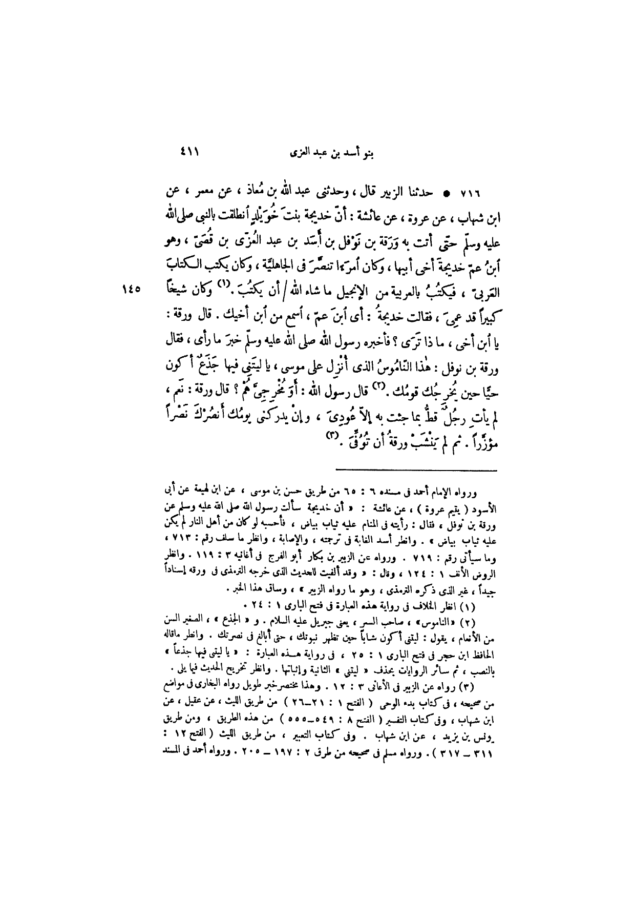 حدثنا الزبير قال، وحدثني عبد الله بن معاذ، عن معمر، عن ابن شهاب، عن عروة، عن عائشة: أن خديجة بنت خويلد انطلقت بالنبي صلى الله عليه وسلم حتى أتت به ورقة بن نوفل بن أسد بن عبد العزي بن قصي، وهو ابن عم خديجة أخي أبيها، وكان امرءًا تنصر في الجاهلية، وكان يكتب الكتاب العربي، فيكتب بالعربية من الإنجيل ما شاء الله أن يكتب. وكان شيخاً كبيراً قد عمي، فقالت خديجة: أي ابن عم، اسمع من ابن أخيك. قال ورقة: يا ابن أخي، ماذا ترى؟ فأخبره رسول الله صلى الله عليه وسلم خبر ما رأى، فقال ورقة بن نوفل: هذا الناموس الذي انزل على موسى، يا ليتني فيها جذع أكون حيا حين يخرجك قومك. قال رسول الله: أو مخرجي هم؟ قال ورقة: نعم، لم يأت رجل قط بما جئت به إلا عودي، وإن يدركني يومك أنصرك نصراً مؤزراً. ثم لم ينشب ورقة أن توفى.