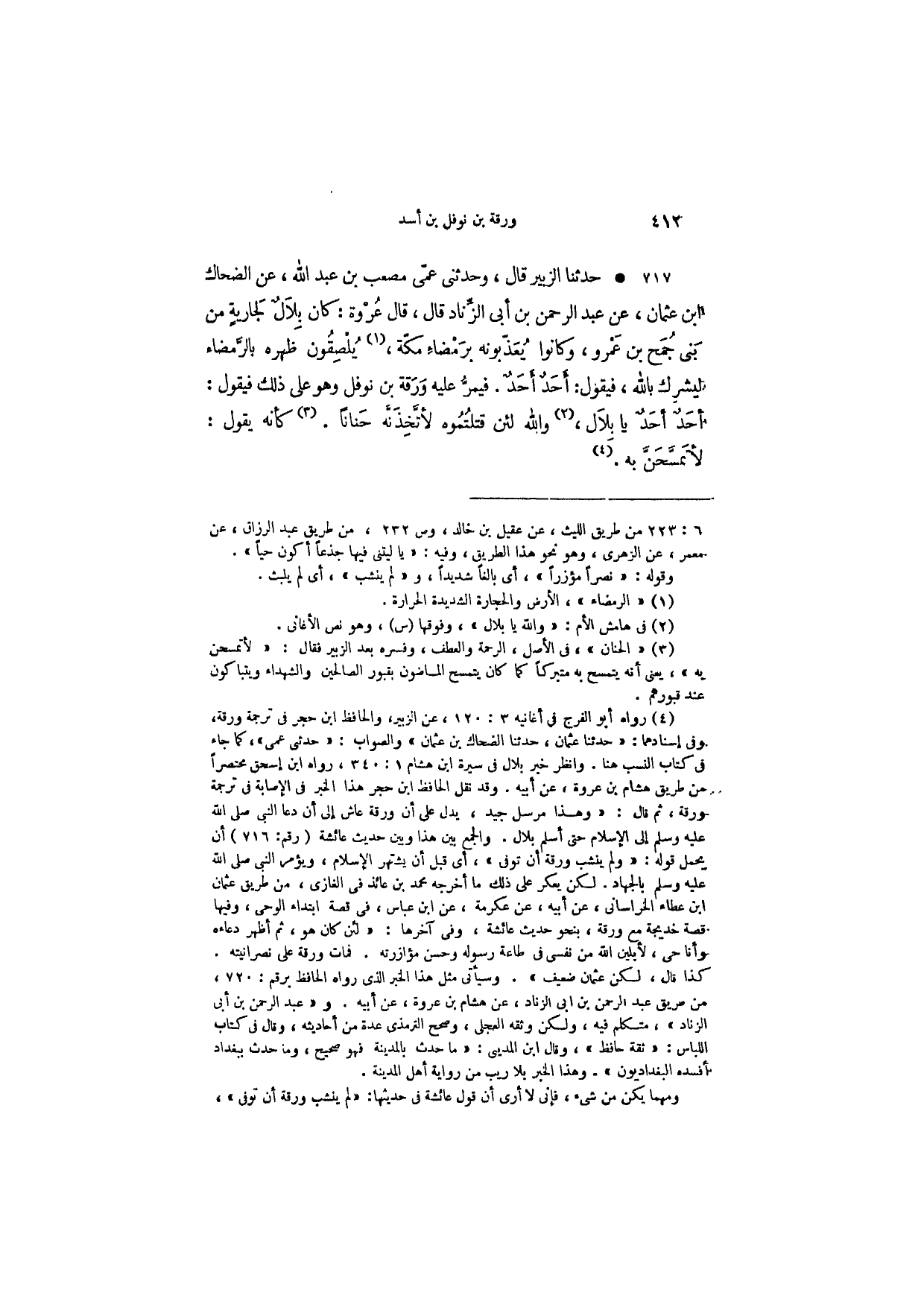 حدثنا الزبير قال، وحدثني عمي مصعب بن عبد الله، عن الضحاك ابن عثمان، عن عبد الرحمن بن أبي الزناد قال، قال عروة: كان بلال لجارية من بني جمح بن عمرو، وكانوا يعذبونه برمضاء مكة، يلصقون ظهره بالرمضاء ليشرك بالله، فيقول: أحَدٌ أحَدٌ. فيمر عليه ورقة بن نوفل وهو على ذلك فيقول: أحَدٌ أحَدٌ يا بلال، والله لئن قتلتموه لأتخذنه حناناً. كأنه يقول: لأتمسحن به.