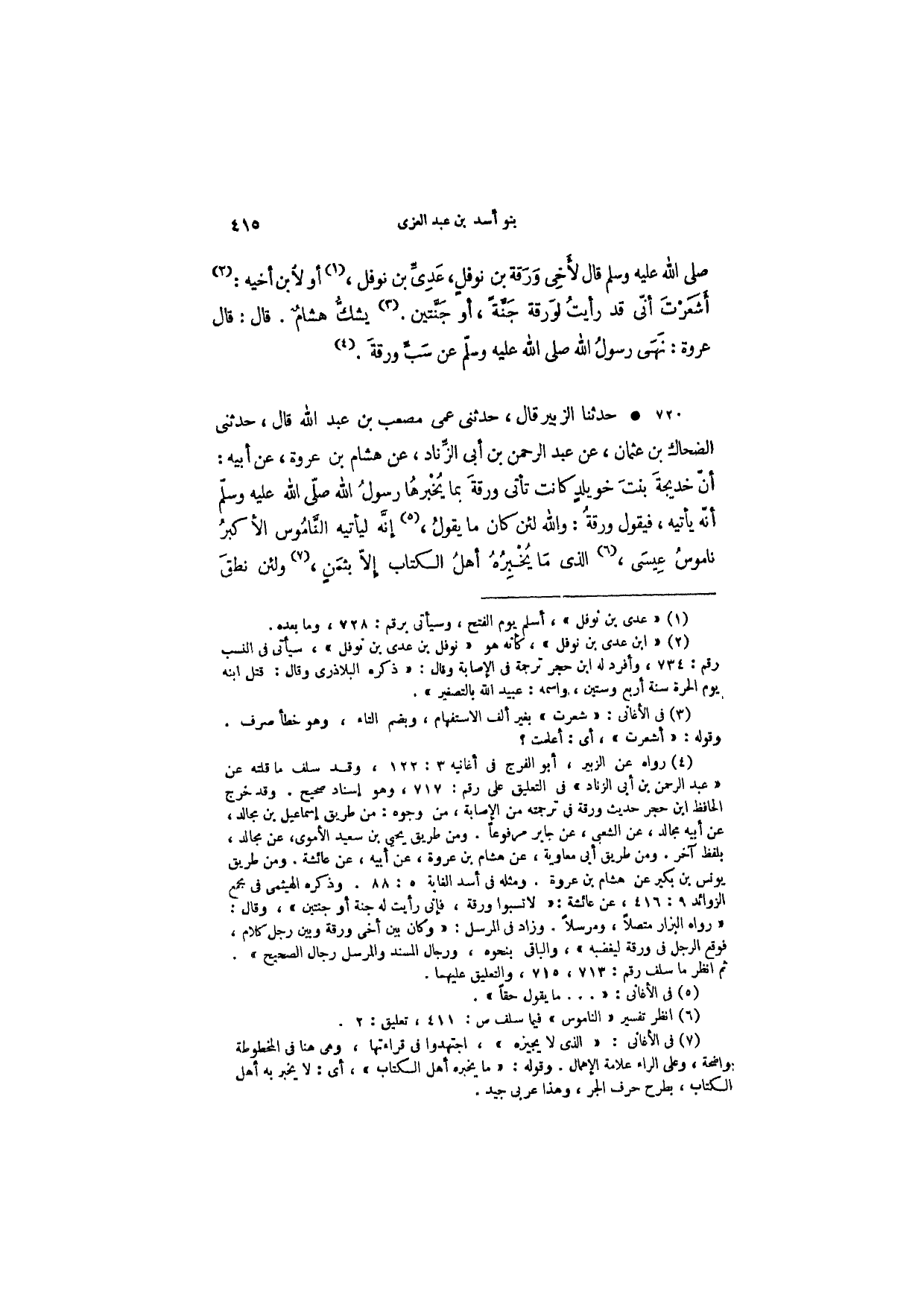 صلى الله عليه وسلم قال لأخي ورقة بن نوفل، عدي بن نوفل، أو لابن أخيه: أشعرت أني قد رأيت لورقة جنة، أو جنتين. يشك هشام. قال: قال عروة: نهى رسول الله صلى الله عليه وسلم عن سب ورقة.