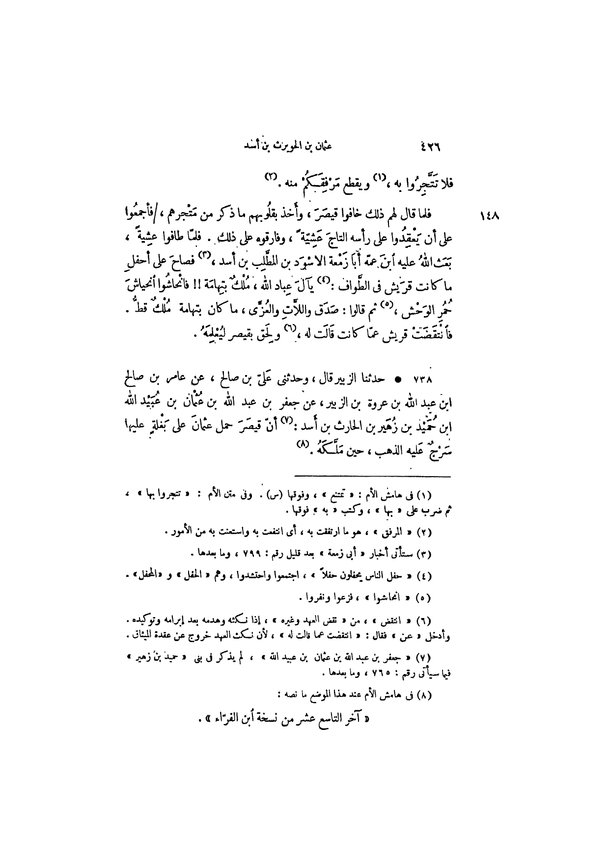 حدثنا الزبير قال، وحدثني علي بن صالح، عن عامر بن صالح ابن عبد الله بن عروة بن الزبير، عن جعفر بن عبد الله بن عثمان بن عبيد الله ابن حميد بن زهير بن الحارث بن أسد: أن قيصر حمل عثمان على بغلة عليها سرج عليه الذهب، حين ملكه.
