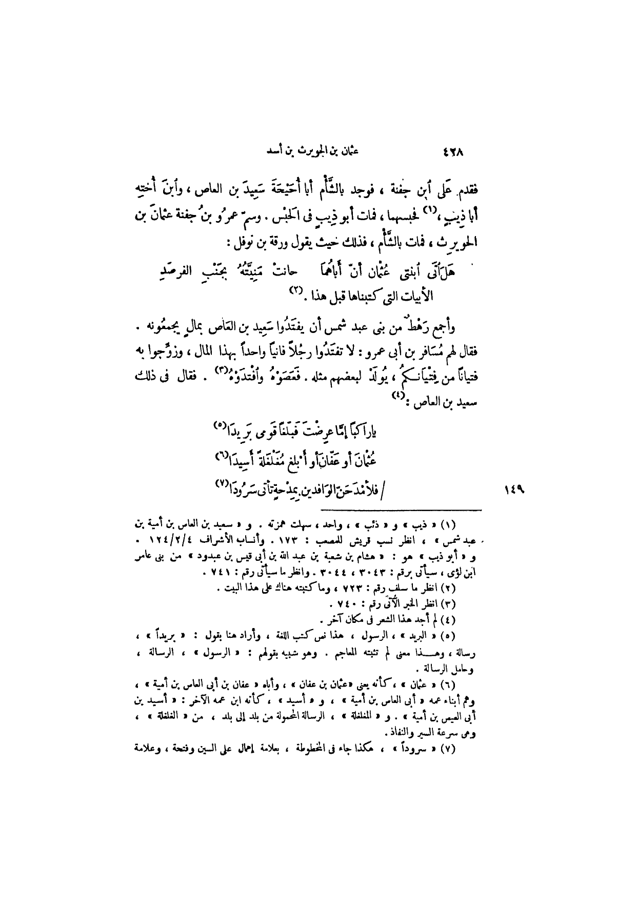 وأجمع رهط من بني عبد شمس أن يفتدوا سعيد بن العاص بمال يجمعونه. فقال لهم مسافر بن أبي عمرو: لا تفتدوا رجلاً فانياً واحداً بهذا المال، وزوجوا به فتياناً من فتيانكم، يولد لبعضهم مثله. فعصوه وافتدوه. فقال في ذلك سعيد بن العاص: