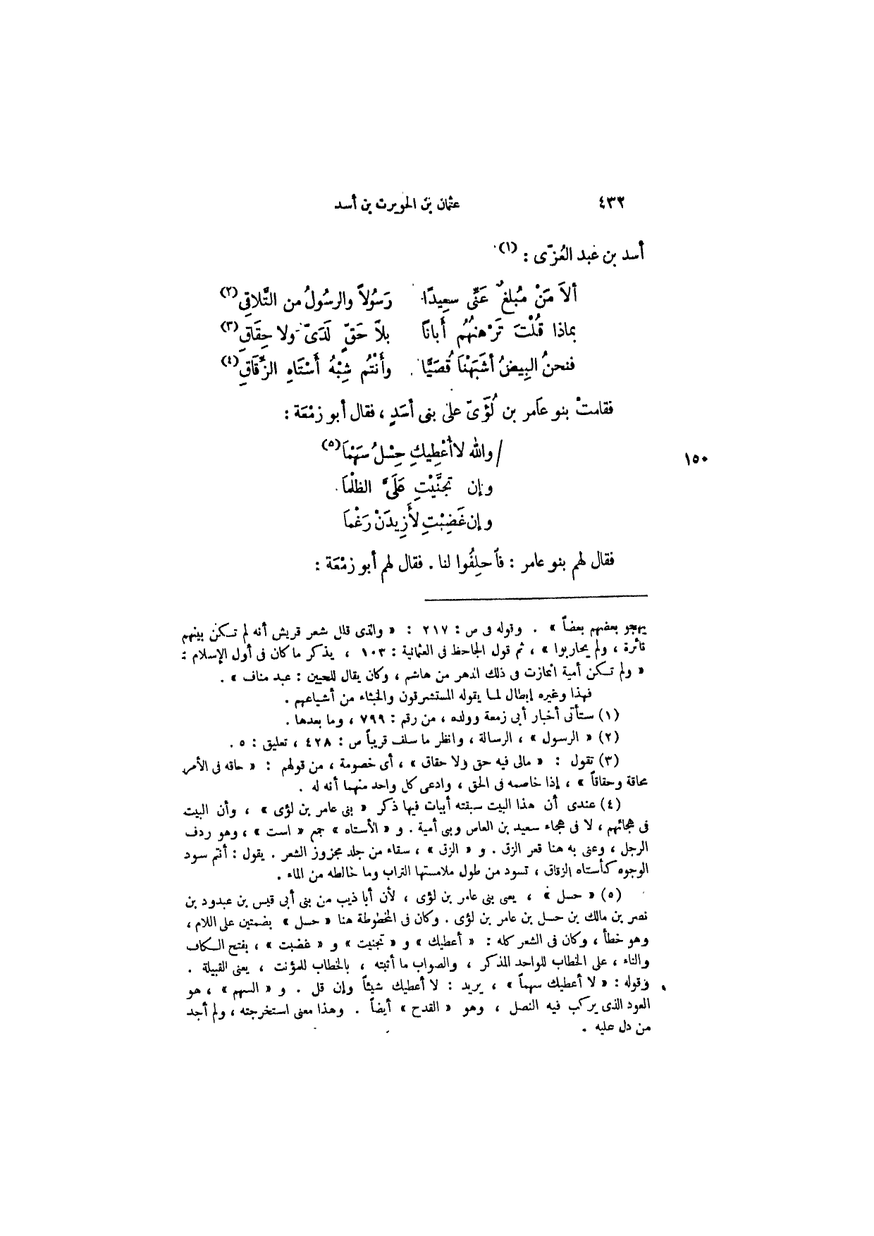 فقامت بنو عامر بن لؤي على بني أسد، فقال أبو زمعة: