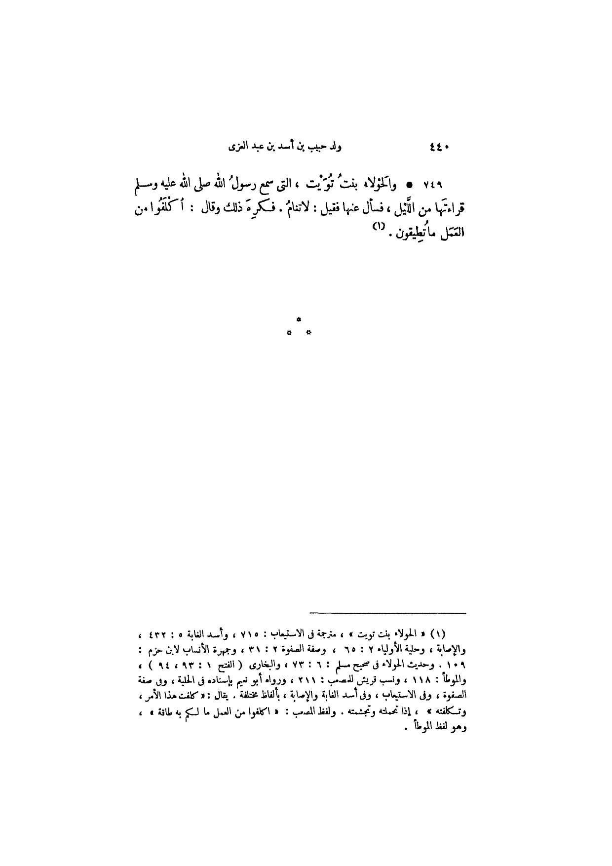والحولاء بنت تويت، التي سمع رسول الله صلى الله عليه وسلم قراءتها من الليل، فسأل عنها فقيل: لا تنام. فكره ذلك وقال: اكلفوا من العمل ما تطيقون.