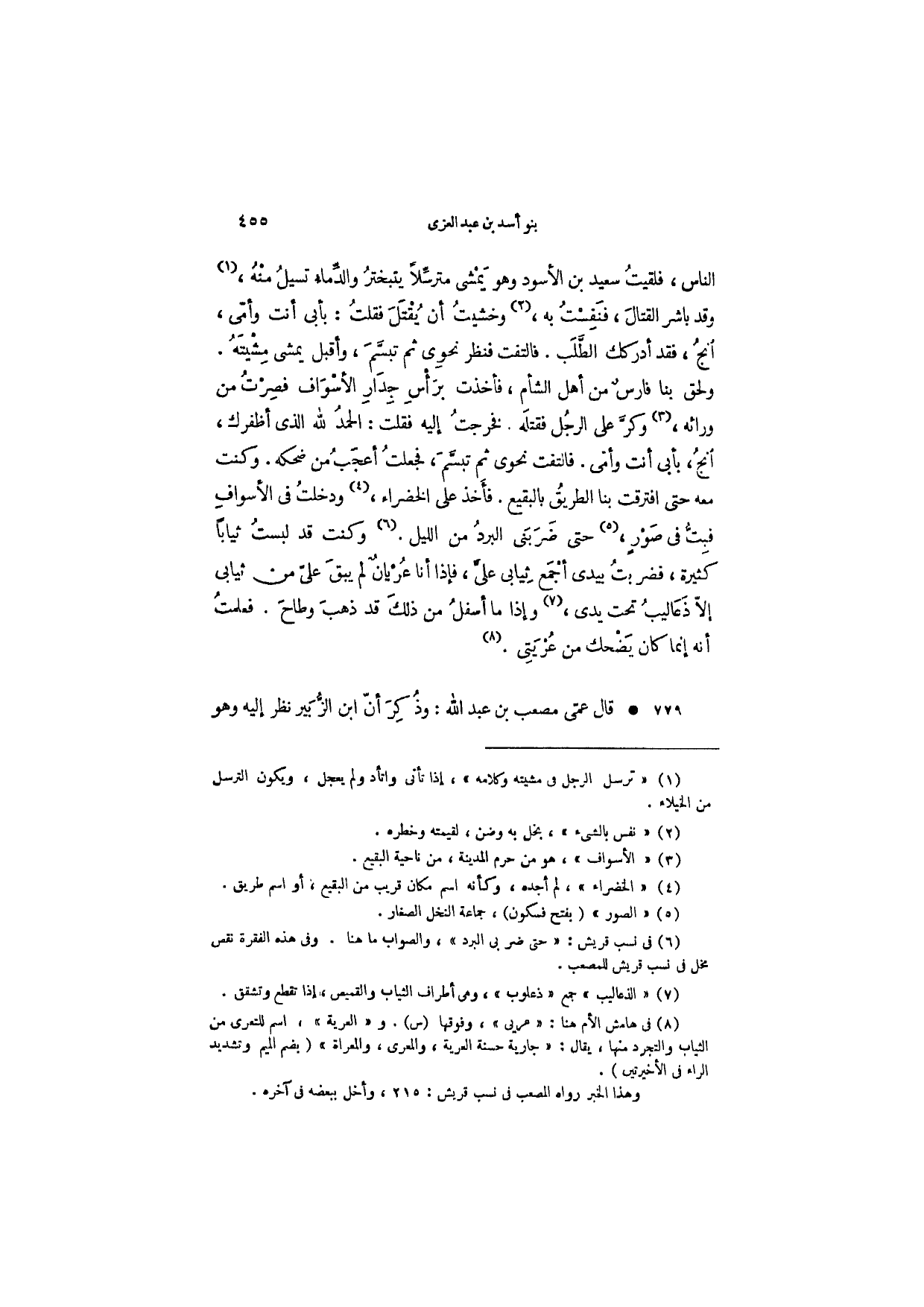 الناس، فلقيت سعيد بن الأسود وهو يمشي مترسلاً يتبختر والدماء تسيل منه، وقد باشر القتال، فنفست به، وخشيت أن يقتل فقلت: بأبي أنت وأمي، أنج، فقد أدركك الطلب. فالتفت فنظر نحوي ثم تبسم، وأقبل يمشي مشيته. ولحق بنا فارس من أهل الشأم، فأخذت برأس جدار الأسواف فصرت من ورائه، وكر على الرجل فقتله. فخرجت إليه فقلت: الحمد لله الذي أظفرك، انج، بأبي أنت وأمي. فالتفت نحوي ثم تبسم، فجعلت أعجب من ضحكة. وكنت معه حتى افترقت بنا الطريق بالبقيع. فأخذ على الخضراء، ودخلت في الأسواف فبت في صور، حتى ضربني البرد من الليل. وكنت قد لبست ثياباً كثيرة، فضربت بيدي أجمع ثيابي عليّ، فإذا أنا عريان لم يبق عليّ من ثيابي إلا ذعاليب تحت يدي، وإذا ما أسفل من ذلك قد ذهب وطاح. فعلمت أنه إنما كان يضحك من عريتي.