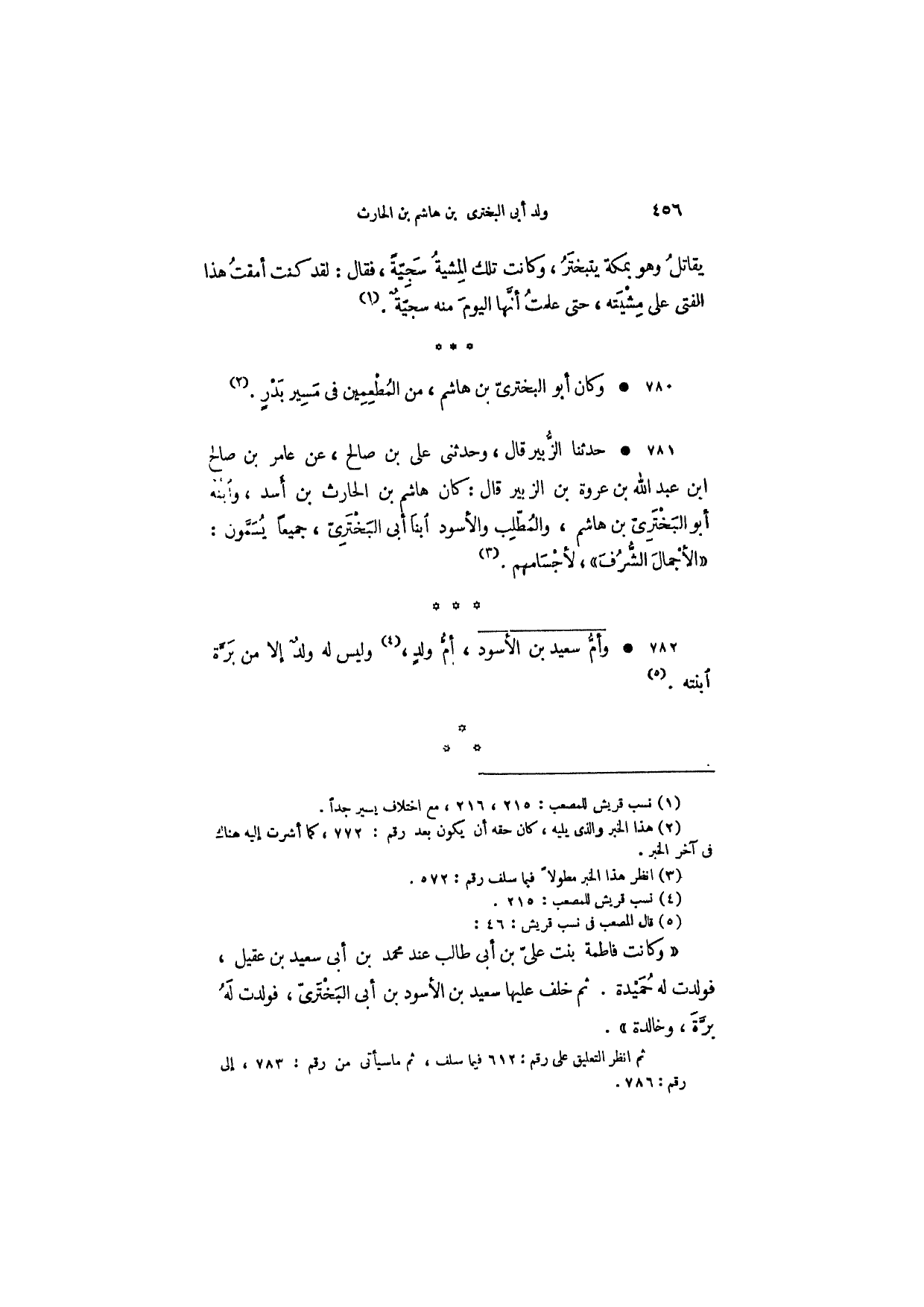 حدثنا الزبير قال، وحدثني علي بن صالح، عن عامر بن صالح ابن عبد الله بن عروة بن الزبير قال: كان هاشم بن الحارث بن اسد، وابنه أبو البختري بن هاشم، والمطلب والأسود ابنا أبي البختري، جميعاً يسمون: " الأجمال الشرف "، لأجسامهم.