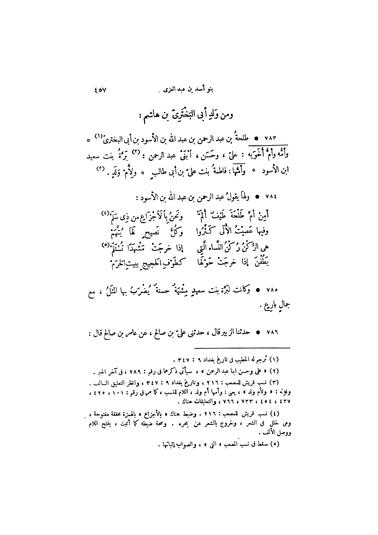 طلحة بن عبد الرحمن بن عبد الله بن الأسود بن أبي البختري وأمه وأم أخويه: علي، وحسن، ابني عبد الرحمن: برة بنت سعيد ابن السود وأمها: فاطمة بنت علي بن أبي طالب ولأم ولد.