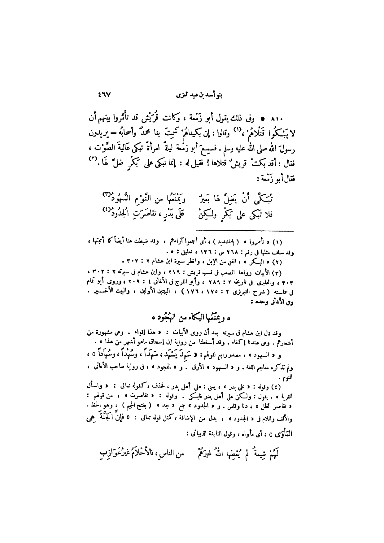 وفي ذلك يقول أبو زمعة، وكانت قريش قد تأمروا بينهم أن لا يبكوا قتلاهم، وقالوا: إن بكيناهم شمت بنا محمد وأصحابه يريدون رسول الله صلى الله عليه وسلم. فسمع أبو زمعة ليلة امرأة تبكي عالية الصوت، فقال: أقد بكت قريش قتلاها؟ فقيل له: إنما تبكي على بكر ضل لها. فقال أبو زمعة: