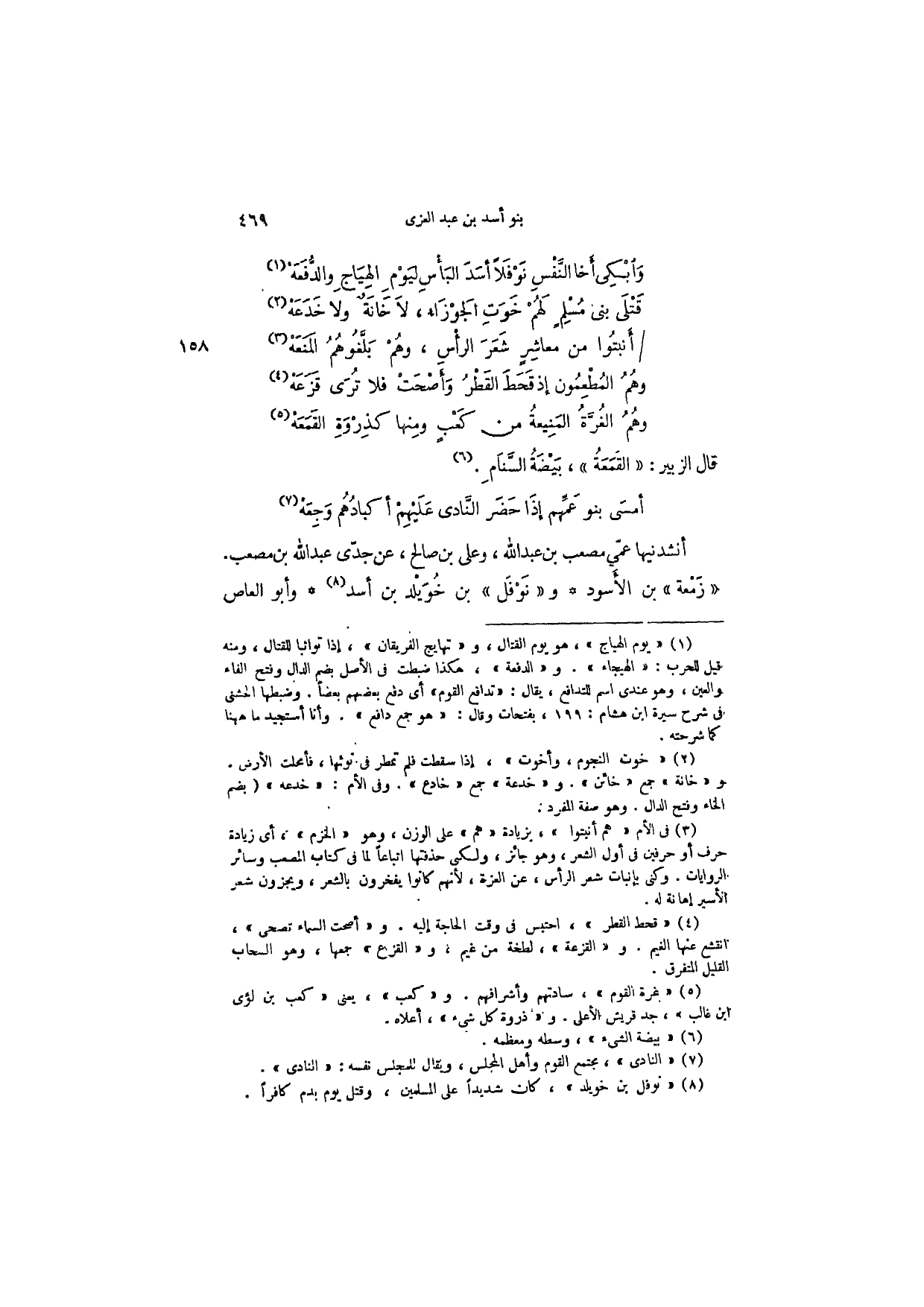 وأبْكِى أخل النَّفْسِ نَوْفَلاً أسَدَ البَأسِ ليَوْمِ الهِيَاجِ والدُّفَعَهْ قَتْلَى بني مُسْلِمٍ لَهُمْ خَوَتِ الجَوْزَاءُ، لاَ خَانَةٌ ولا خَدَعَهْ أنبتُوا من معاشِرٍ شَعَرَ الرأْسِ، وهُمْ بَلَّغُوهُمُ المَنَعَهْ وهُمُ المُطْعِمُون إذ قَحَطَ القَطْرُ وأصْحَتْ فلا تُرَى قَزَعَهْ وهُمُ الغُرَّةُ المَنِيعةُ من كَعْبٍ ومِنها كذِرْوَةِ القَمَعَةْ قال الزبير: " القمعة "، بيضة السنام.