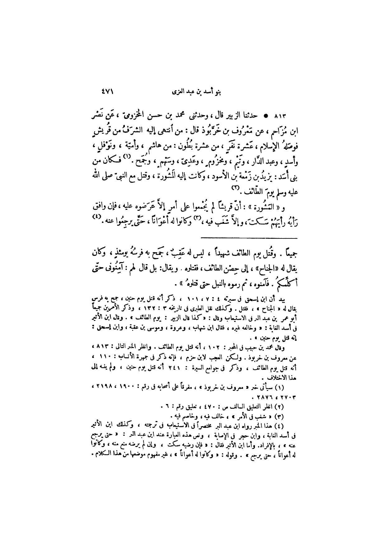 حدثنا الزبير قال، وحدثني محمد بن حسن المخزومي، عن نصر ابن مزاحم، عن معروف بن خربوذ قال: من انتهى إليه الشرف من قريش فوصله الإسلام، عشرة بطون: من هاشم، وأمية، ونوفل، وأسد، وعبد الدار، وتيم، ومخزوم، وعدي، وسهم، وجمح. فكان من بني أسد: يزيد بن زظمعة بن الأسود، وكانت إليه المشورة، وقتل مع النبي صلى الله عليه وسلم يوم الطائف.