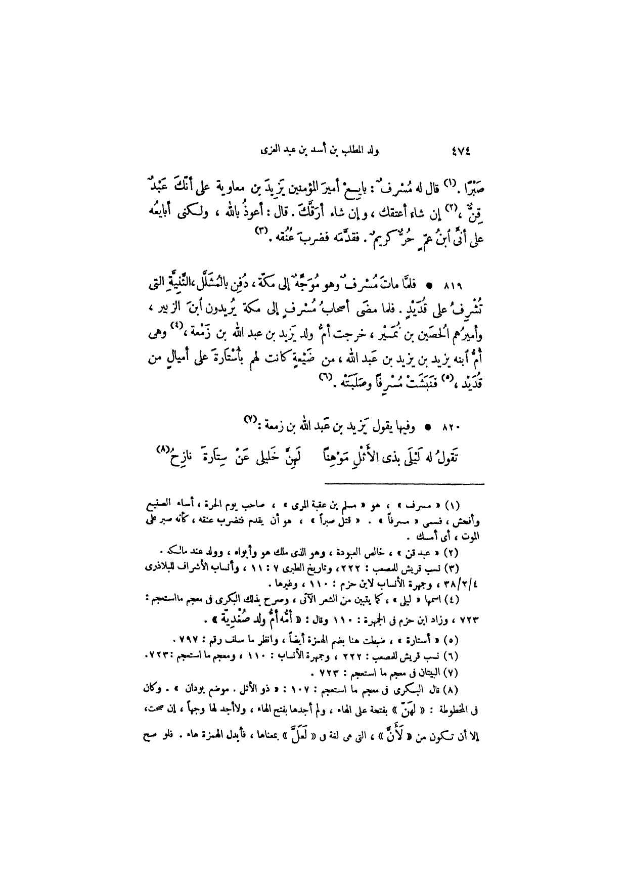 صبرا. قال له مسرف: بايع أمير المؤمنين يزيد بن معاوية على أنك عبد قن، إن شاء أعتقك، وإن شاء أرقك. قال: أعوذ بالله، ولكني أبايعه على أني ابن عم حر كريم. فقدمه فضرب عنقه.
