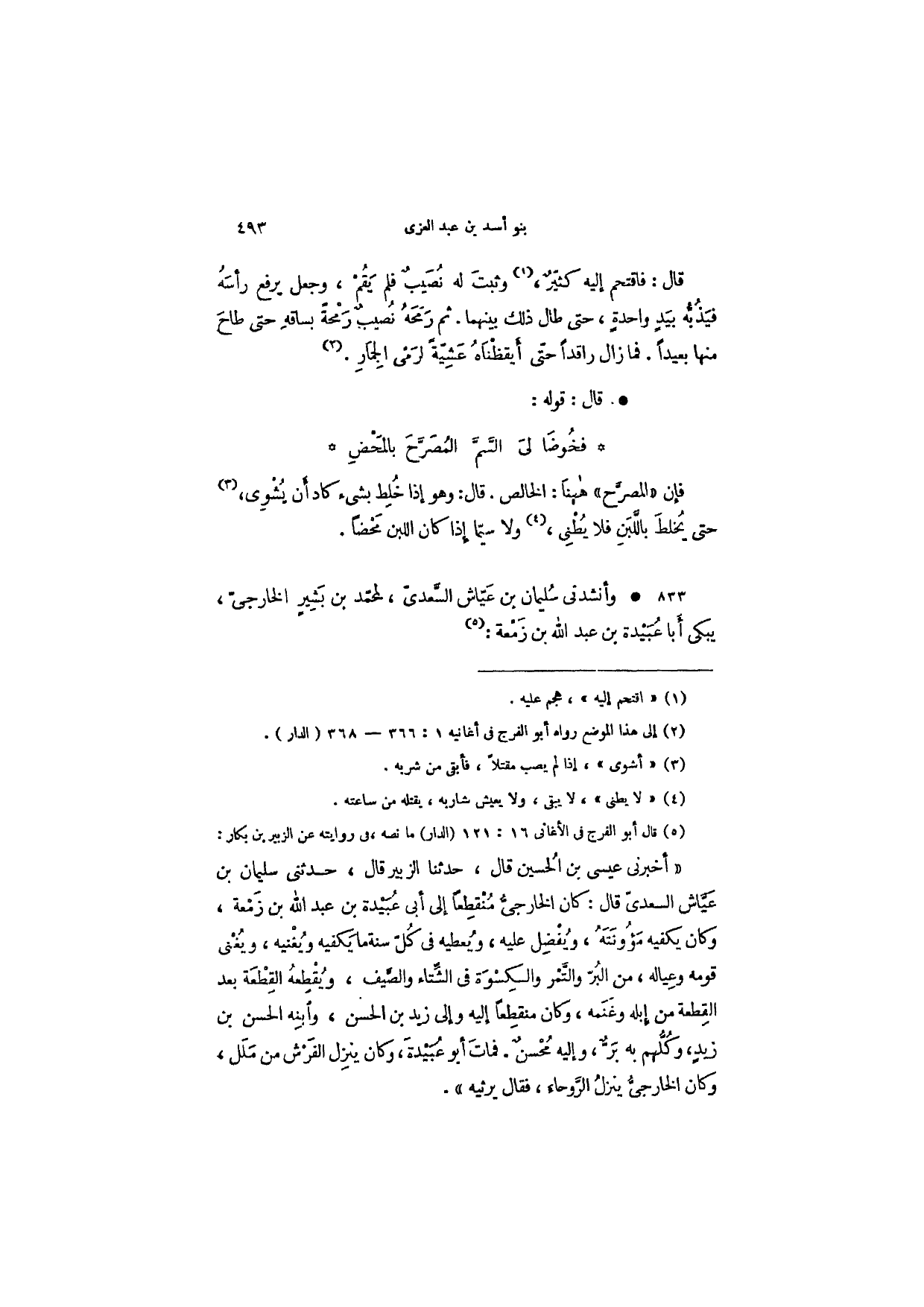 قال: فاقتحم إليه كثير، وثبت له نصيب فلم يقم، وجعل يرفع رأسه فيذيبه بيد واجدة، حتى طال ذلك بينهما. ثم رمحه نصيب رمحة بساقه حتى طاح منها بعيداً. فما زال راقداً حتى أيقضناه عشية لرمي الجمار.
