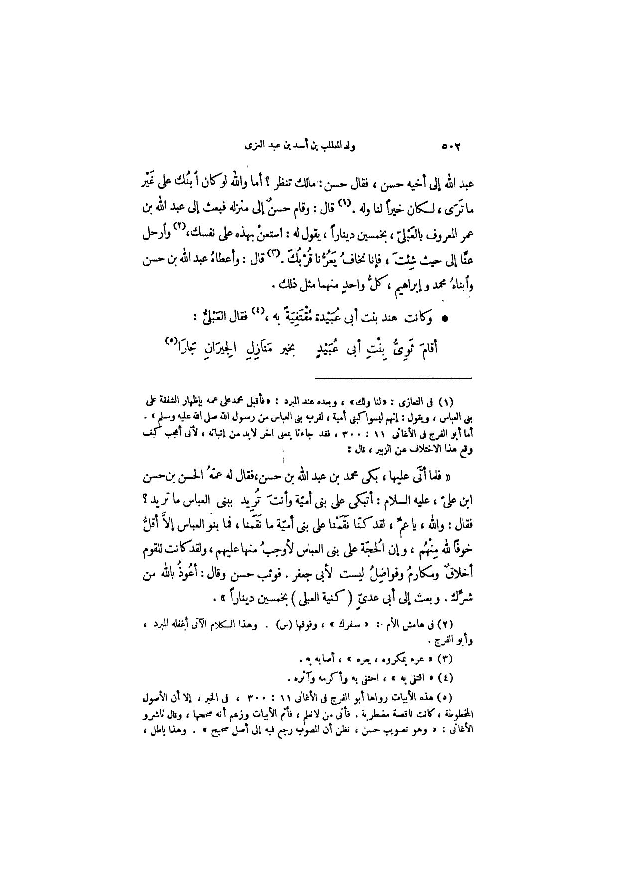 عبد الله إلى أخيه حسن، فقال حسن: مالك تنظر؟ أما والله لو كان ابنك على غير ما ترى، لكان خيراً لنا وله. قال: وقام حسن إلى منزله فبعث إلى عبد الله بن عمر المعروف بالعبلي، بخمسين ديناراً، يقول له: استعن بهذه على نفسك، وارحل عنا إلى حيث شئت، فإنا نخاف يعرنا قربك. قال: وأعطاه عبد الله بن حسن وابناه محمد وإبراهيم، كل واحد منهما مثل ذلك.
