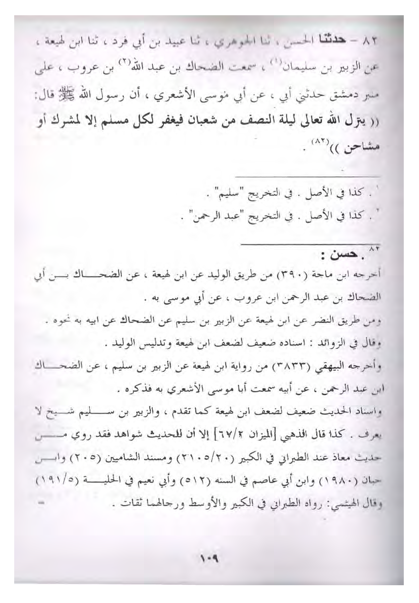82- حَدَّثَنَا الْحَسَنُ، ثَنَا الْجَوْهَرِيُّ، ثَنَا عُبَيْدُ بْنُ أبي فرد، ثَنَا ابْنُ لَهِيعَةَ، عَنِ الزُّبَيْرِ بْنِ سُلَيْمَانَ، سمعت الضحاك بن عبد الله بن عروب، عَلَى مِنْبَرِ دِمَشْقَ حَدَّثَنِي أَبِي، عَنْ أَبِي مُوسَى الأَشْعَرِيِّ، أَنَّ رَسُولَ اللَّهِ صَلَّى اللَّهُ عَلَيْهِ وَسَلَّمَ قَالَ: ((يَنْزِلُ اللَّهُ تَعَالَى لَيْلَةَ النِّصْفِ مِنْ شَعْبَانَ فَيَغْفِرُ لِكُلِّ مُسْلِمٍ إِلا لِمُشْرِكٍ أَوْ مُشَاحِنٍ)) .