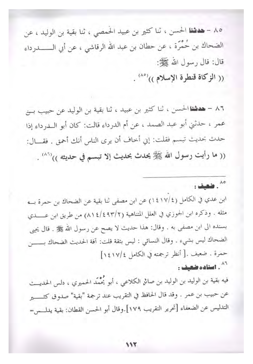 86- حَدَّثَنَا الْحَسَنُ، ثَنَا كَثِيرُ بْنُ عُبَيْدٍ، ثَنَا بَقِيَّةُ بْنُ الْوَلِيدِ عَنْ حَبِيبِ بْنِ عُمَرَ، حَدَّثَنِي أَبُو عَبْدِ الصَّمَدِ، عَنْ أُمِّ الدَّرْدَاءِ قَالَتْ: كَانَ أَبُو الدَّرْدَاءِ إِذَا حَدَّثَ بِحَدِيثٍ تَبَسَّمَ فَقُلْتُ: إِنِّي أَخَافُ أَنْ يَرَى النَّاسُ أَنَّكَ أَحْمَقُ. فَقَالَ: ((مَا رَأَيْتُ رَسُولَ اللَّهِ صَلَّى اللَّهُ عَلَيْهِ وَسَلَّمَ يُحَدِّثُ بِحَدِيثٍ إِلا تَبَسَّمَ فِي حَدِيثِهِ)) .
