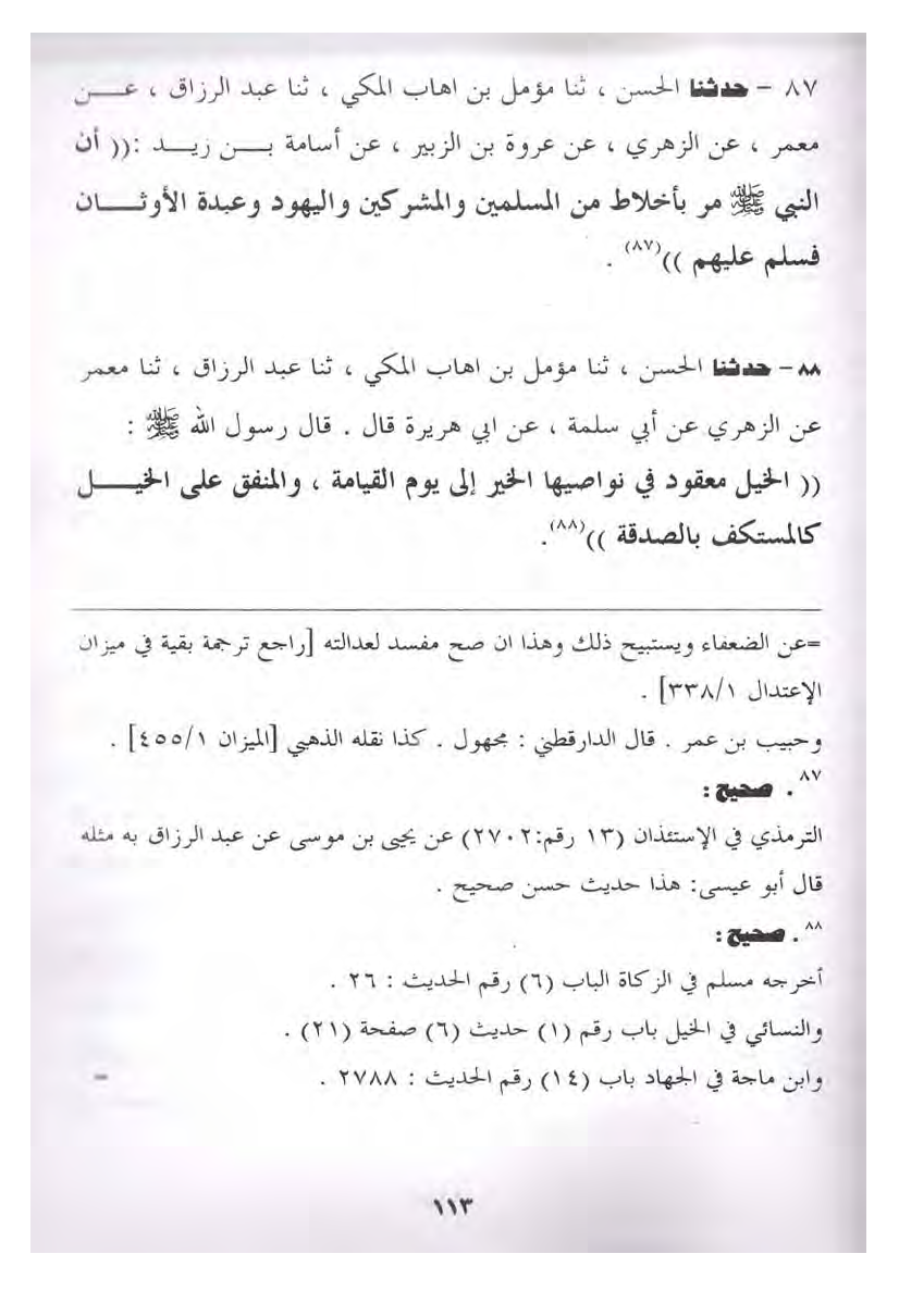 87- حدثنا الحسن، ثنا مؤمل بن إهاب المكي، ثَنَا عَبْدُ الرَّزَّاقِ، عَنْ مَعْمَرٍ، عَنِ الزُّهْرِيِّ، عَنْ عُرْوَةَ بْنِ الزُّبَيْرِ، عَنْ أُسَامَةَ بْنِ زَيْدٍ: ((أَنَّ النَّبِيَّ صَلَّى اللَّهُ عَلَيْهِ وَسَلَّمَ مَرَّ بِأَخْلاطٍ مِنَ الْمُسْلِمِينَ وَالْمُشْرِكِينَ وَالْيَهُودِ وَعَبَدَةِ الأَوْثَانِ فَسَلَّمَ عَلَيْهِمْ)) .
