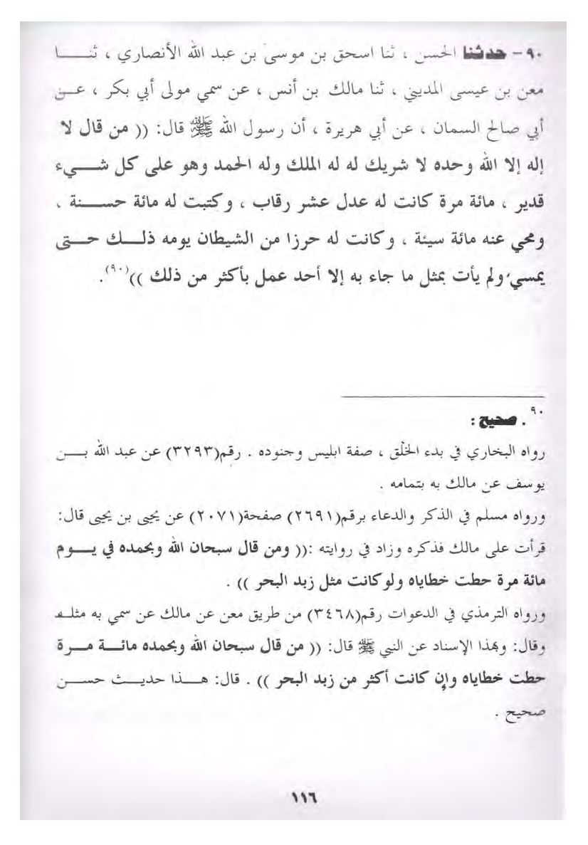 90- حَدَّثَنَا الْحَسَنُ، ثَنَا إِسْحَاقُ بْنُ مُوسَى بْنِ عَبْدِ اللَّهِ الأَنْصَارِيُّ، ثَنَا مَعْنُ بْنُ عِيسَى المديني، ثَنَا مَالِكُ بْنُ أَنَسٍ، عَنْ سُمَيٍّ مَوْلَى أَبِي بَكْرٍ، عَنْ أَبِي صَالِحٍ السَّمَّانِ، عَنْ أَبِي هُرَيْرَةَ، أَنَّ رَسُولَ اللَّهِ صَلَّى اللَّهُ عَلَيْهِ وَسَلَّمَ قَالَ: ((مَنْ قَالَ لا إِلَهَ إِلا اللَّهُ وَحْدَهُ لا شَرِيكَ لَهُ لَهُ الْمُلْكُ وَلَهُ الْحَمْدُ وَهُوَ عَلَى كُلِّ شَيْءٍ قَدِيرٌ، مِائَةَ مَرَّةٍ كَانَتْ لَهُ عِدْلَ عَشْرِ رقاب، وكتبت لَهُ مِائَةُ حَسَنَةٍ، وَمُحِيَ عَنْهُ مِائَةُ سَيِّئَةٍ. وَكَانَتْ لَهُ حِرْزًا مِنَ الشَّيْطَانِ يَوْمَهُ ذَلِكَ حتى يمسي ولم يأت بِمِثْلِ مَا جَاءَ بِهِ إِلا أَحَدٌ عَمِلَ بِأَكْثَرَ مِنْ ذَلِكَ)) .