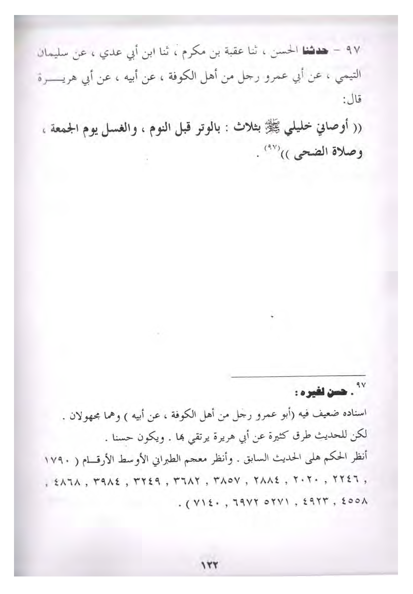 97- حَدَّثَنَا الْحَسَنُ، ثَنَا عُقْبَةُ بْنُ مُكْرَمٍ، ثَنَا ابْنُ أَبِي عَدِيٍّ، عَنْ سُلَيْمَانَ التَيْمِيِّ، عَنْ أَبِي عَمْرٍو رَجُلٍ مِنْ أَهْلِ الْكُوفَةِ، عَنْ أَبِيهِ، عَنْ أَبِي هُرَيْرَةَ قَالَ: