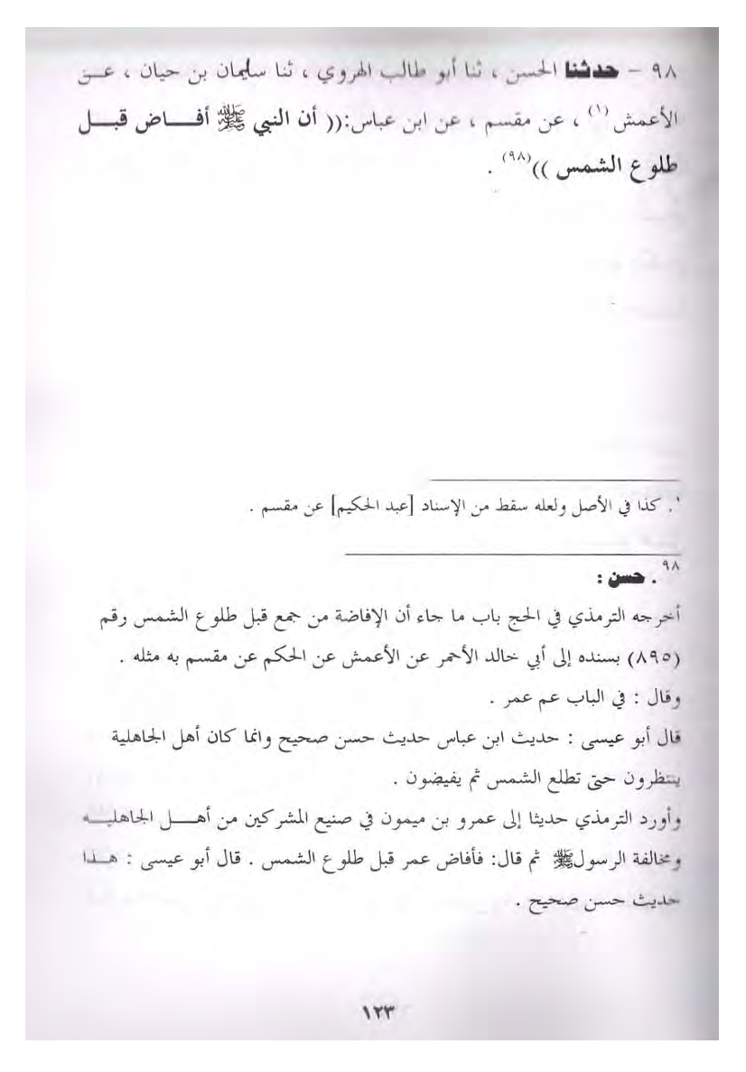 98- حَدَّثَنَا الْحَسَنُ، ثَنَا أَبُو طَالِبٍ الْهَرَوِيُّ، ثَنَا سُلَيْمَانُ بْنُ حَيَّانَ، عَنِ الأَعْمَشِ، عَنْ مِقْسَمٍ، عَنِ ابْنِ عَبَّاسٍ: ((أَنَّ النَّبِيَّ صَلَّى اللَّهُ عَلَيْهِ وَسَلَّمَ أَفَاضَ قَبْلَ طُلُوعِ الشَّمْسِ)) .