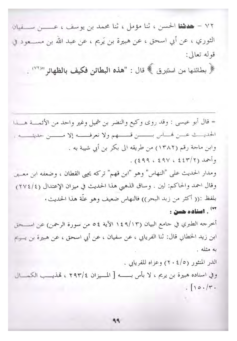 72- حَدَّثَنَا الْحَسَنُ، ثَنَا مُؤَمَّلٌ، ثَنَا مُحَمَّدُ بْنُ يوسف، عن سفيان الثوري، عن أبي إسحق، عَنْ هُبَيْرَةَ بْنِ يَرِيمَ، عَنْ عَبْدِ اللَّهِ بْنِ مَسْعُودٍ فِي قَوْلِهِ تَعَالَى: