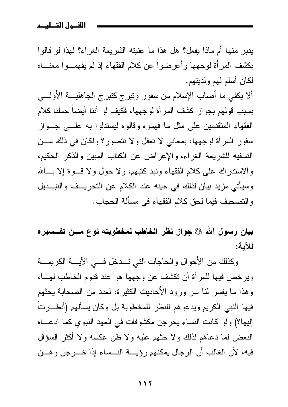 ألا يكفي ما أصاب الإسلام من سفور وتبرج كتبرج الجاهلية الأولي بسبب قولهم بجواز كشف المرأة لوجهها، فكيف لو أننا أيضاً حملنا كلام الفقهاء المتقدمين على مثل ما فهموه وقالوه ليستدلوا به على جواز سفور المرأة لوجهها، بمعاني لا تعقل ولا تتصور؟ ولكان في ذلك من التسفيه للشريعة الغراء، والإعراض عن الكتاب المبين والذكر الحكيم، والاستدراك على كلام الفقهاء ونبذ كتبهم، ولا حول ولا قوة إلا بالله وسيأتي مزيد بيان لذلك في حينه عند الكلام عن التحريف والتبديل والتصحيف فيما لحق كلام الفقهاء في مسألة الحجاب.