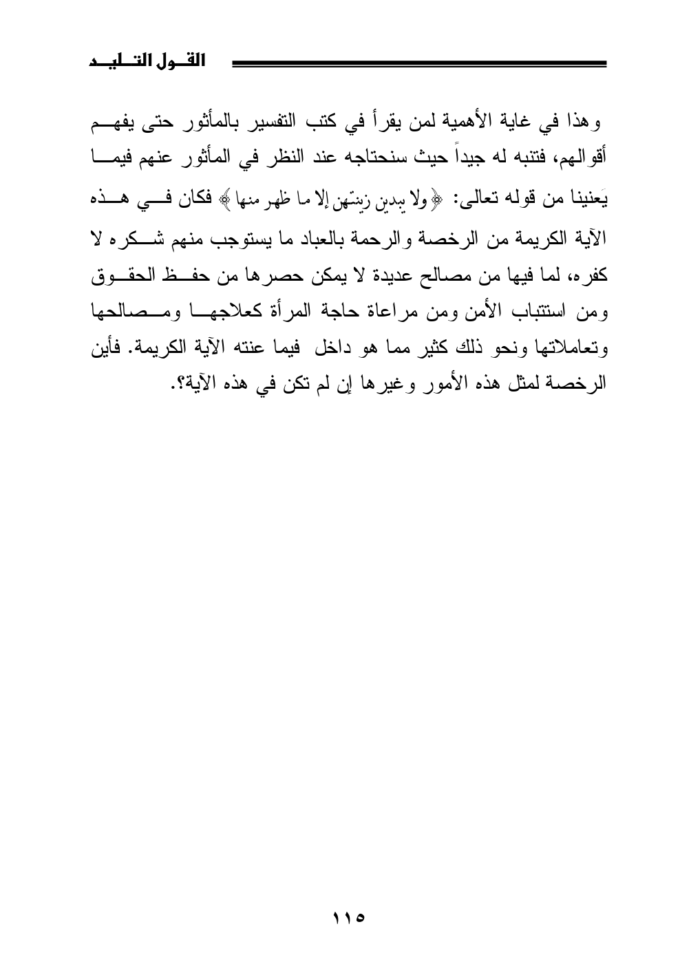 وهذا في غاية الأهمية لمن يقرأ في كتب التفسير بالمأثور حتى يفهم أقوالهم، فتنبه له جيداً حيث سنحتاجه عند النظر في المأثور عنهم فيما يَعنينا من قوله تعالى: {ولا يبدين زينتهن إلا ما ظهر منها} فكان في هذه الآية الكريمة من الرخصة والرحمة بالعباد ما يستوجب منهم شكره لا كفره، لما فيها من مصالح عديدة لا يمكن حصرها من حفظ الحقوق ومن استتباب الأمن ومن مراعاة حاجة المرأة كعلاجها ومصالحها وتعاملاتها ونحو ذلك كثير مما هو داخل فيما عنته الآية الكريمة. فأين الرخصة لمثل هذه الأمور وغيرها إن لم تكن في هذه الآية؟ .