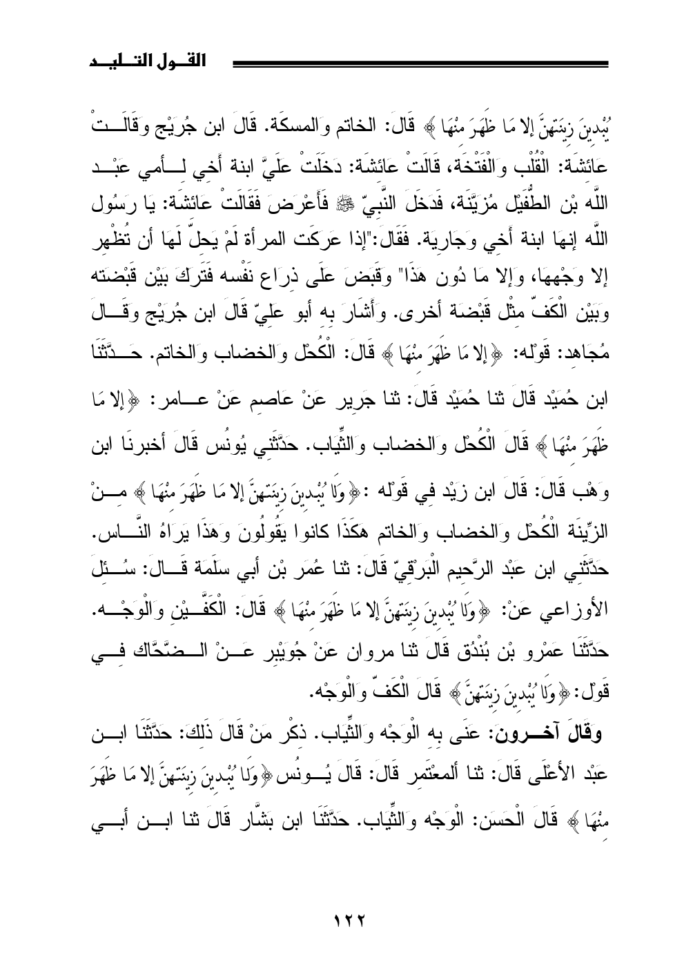 يُبْدِينَ زِينَتهنَّ إلا مَا ظَهَرَ مِنْهَا} قَالَ: الخاتم وَالمسكَة. قَالَ ابن جُرَيْج وَقَالَتْ عَائِشَة: الْقُلْب وَالْفَتْخَة, قَالَتْ عَائِشَة: دَخَلَتْ عَلَيَّ ابنة أَخِي لِأمي عَبْد اللَّه بْن الطُّفَيْل مُزَيَّنَة, فَدَخَلَ النَّبِيّ - صلى الله عليه وسلم - فَأَعْرَضَ فَقَالَتْ عَائِشَة: يَا رَسُول اللَّه إنهَا ابنة أَخِي وَجَارِيَة. فَقَالَ: "إذا عَرَكَت المرأة لَمْ يَحِلّ لَهَا أن تُظْهِر إلا وَجْههَا, وَإلا مَا دُون هَذَا" وَقَبَضَ عَلَى ذِرَاع نَفْسه فَتَرَكَ بَيْن قَبْضَته وَبَيْن الْكَفّ مِثْل قَبْضَة أخرى. وَأَشَارَ بِهِ أبو عَلِيّ قَالَ ابن جُرَيْج وَقَالَ مُجَاهِد: قَوْله: {إلا مَا ظَهَرَ مِنْهَا} قَالَ: الْكُحْل وَالخضاب وَالخاتم. حَدَّثَنَا ابن حُمَيْد قَالَ ثنا حُمَيْد قَالَ: ثنا جَرِير عَنْ عَاصِم عَنْ عامر: {إلا مَا ظَهَرَ مِنْهَا} قَالَ الْكُحْل وَالخضاب وَالثِّيَاب. حَدَّثَنِي يُونُس قَالَ أخبرنَا ابن وَهْب قَالَ: قَالَ ابن زَيْد فِي قَوْله: {وَلَا يُبْدِينَ زِينَتهنَّ إلا مَا ظَهَرَ مِنْهَا} مِنْ الزِّينَة الْكُحْل وَالخضاب وَالخاتم هَكَذَا كانوا يَقُولُونَ وَهَذَا يَرَاهُ النَّاس. حَدَّثَنِي ابن عَبْد الرَّحِيم الْبَرْقِيّ قَالَ: ثنا عُمَر بْن أبي سَلَمَة قَالَ: سُئِلَ الأوزاعي عَنْ: {وَلَا يُبْدِينَ زِينَتهنَّ إلا مَا ظَهَرَ مِنْهَا} قَالَ: الْكَفَّيْنِ وَالْوَجْه.