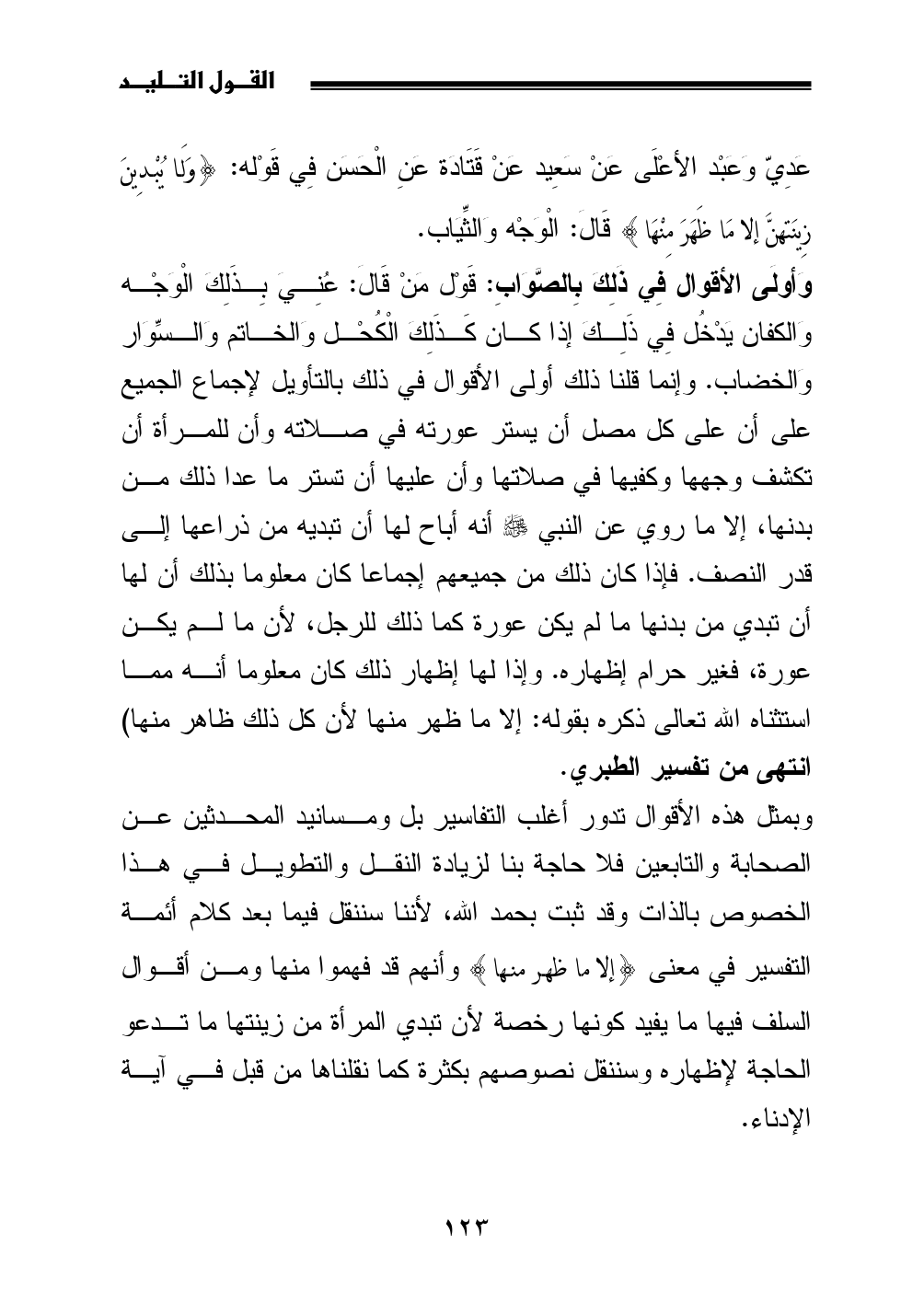 وبمثل هذه الأقوال تدور أغلب التفاسير بل ومسانيد المحدثين عن الصحابة والتابعين فلا حاجة بنا لزيادة النقل والتطويل في هذا الخصوص بالذات وقد ثبت بحمد الله، لأننا سننقل فيما بعد كلام أئمة التفسير في معنى {إلا ما ظهر منها} وأنهم قد فهموا منها ومن أقوال السلف فيها ما يفيد كونها رخصة لأن تبدي المرأة من زينتها ما تدعو الحاجة لإظهاره وسننقل نصوصهم بكثرة كما نقلناها من قبل في آية الإدناء.