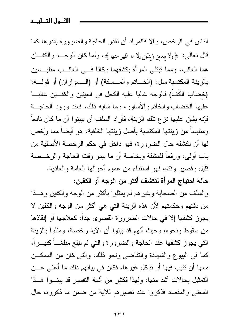 والسلف من الصحابة وغيرهم لم يمثلوا بأكثر من الوجه والكفين وهذا من دقتهم وحكمتهم لأن هذه الزينة التي هي أكثر من الوجه والكفين لا يجوز كشفها إلا في حالات الضرورة القصوى جداً، كعلاجها أو إنقاذها من سقوط ونحوه، وحيث أنهم قد بينوا أن الآية رخصة، ومثلوا بالزينة التي يجوز كشفها عند الحاجة والضرورة والتي لم تبلغ مبلغاً كبيراً، كما في البيوع والشهادة والتقاضي ونحو ذلك، والتي كان من الممكن معها أن تنيب فيها أو توكل غيرها، فكان في بيانهم ذلك ما أغنى عن التمثيل بحالات أشد منها، ولهذا فكثير من أئمة التفسير قد بينوا هذا المعنى والمقصد فذكروا عند تفسيرهم للآية من ضمن ما ذكروه، حال